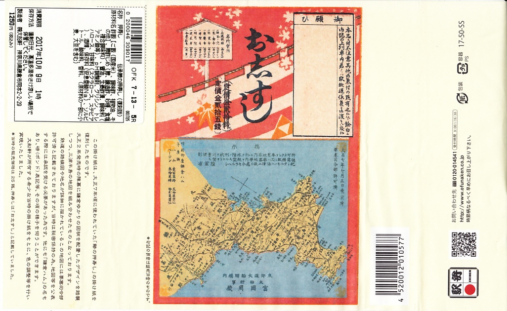 2017(平成29)年10月8日に購入した、大船駅弁の掛紙。同年秋のJR東日本の駅弁キャンペーン「駅弁味の陣2017」へのエントリーに合わせて同年10月から11月まで、1918(大正7)年頃に使われていた掛紙の絵柄を取り入れた、この掛紙を巻いて販売された。価格と中身は、通常版と同じ。1899(明治32)年から1945(昭和20)年まで法定の要塞地帯であった三浦半島の地図が、東京湾要塞司令部の許可のもと、掛紙に描かれている。
