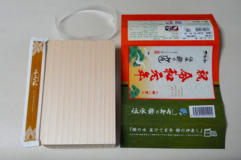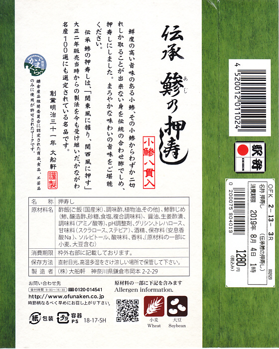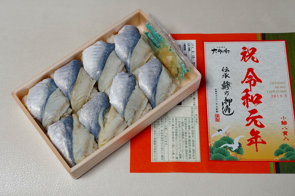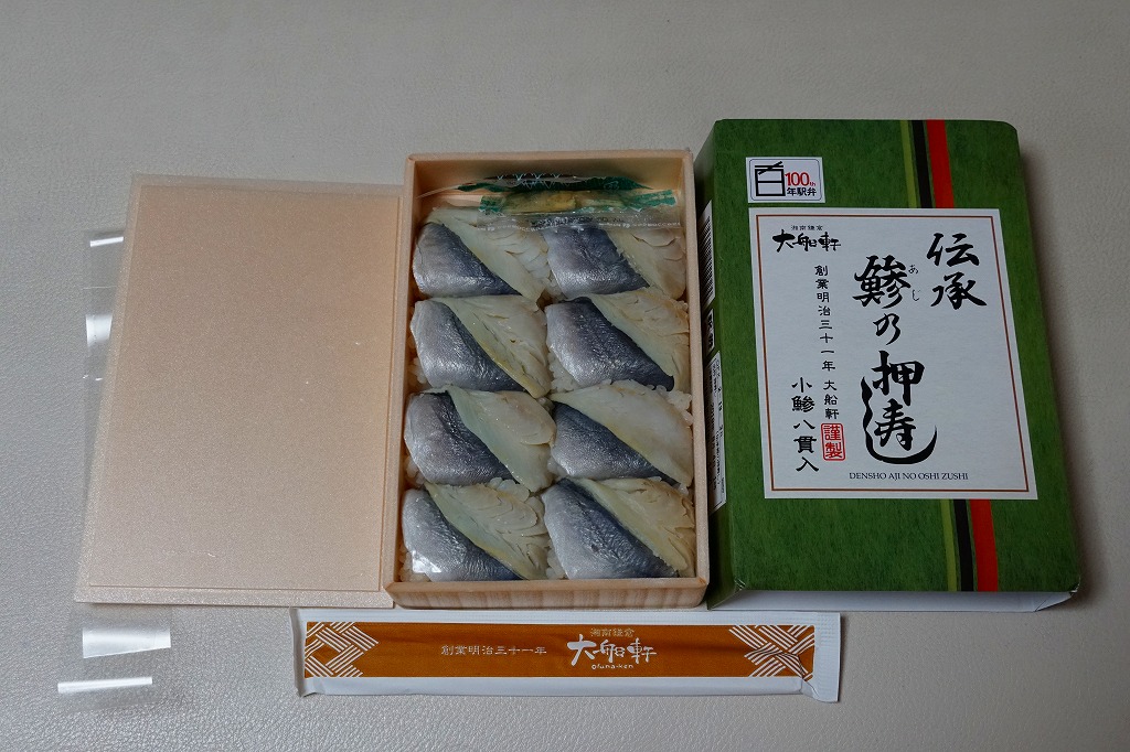 2019(令和元)年8月3日に購入した、大船駅弁のスリーブ。九州で水揚げされたマアジのSサイズ「小あじ」を半身で酢飯に巻き付けた、押し寿司というか握り寿司を一口サイズで8個整列し、甘酢生姜と醤油の小袋を詰めた。2012(平成24)年7月に従前の「特上鯵の押寿し」を、「伝承鯵の押寿し」へ改称のうえリニューアル。同時に、小鯵の高騰や入手難により中鯵のスライスでつくった「鯵の押寿し」は、「鯵の押寿し中鯵」となった。いずれも包装を掛紙からボール紙枠に切り替え。