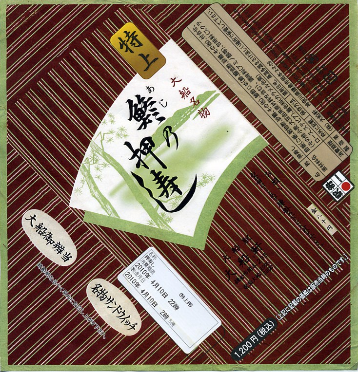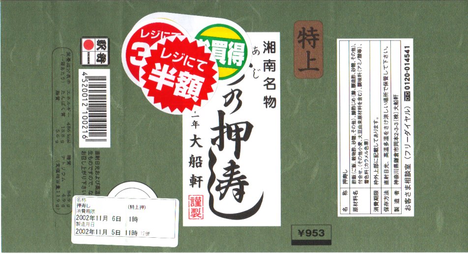 2002(平成14)年11月5日の調製である、大船駅弁の掛紙。これは駅ではなく、デパートやスーパーで販売されたもの。容器や中身は駅で買えるものとまったく同じだが、掛紙に記載された定価が、税込価格1,000円ではなく税抜価格953円であり、駅弁マークの位置や成分表示の有無など細かい点で異なる。駅売りの駅弁に割引はないが、ここではスーパーの閉店直前で半額にて買えた。