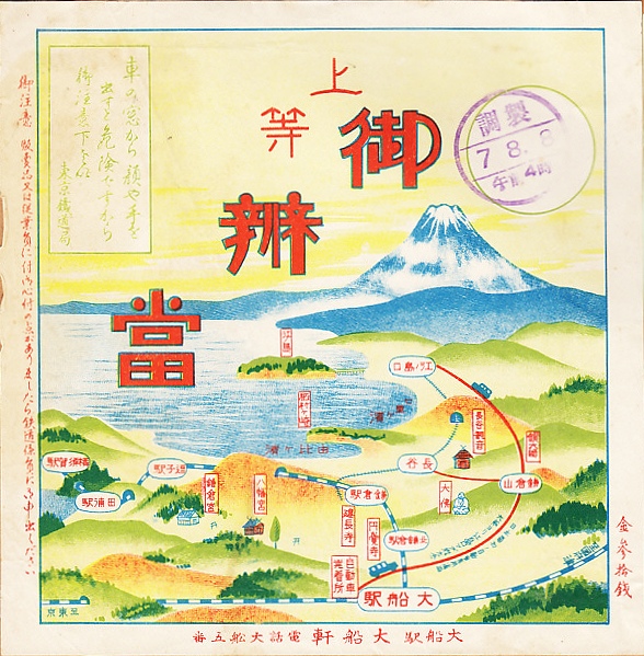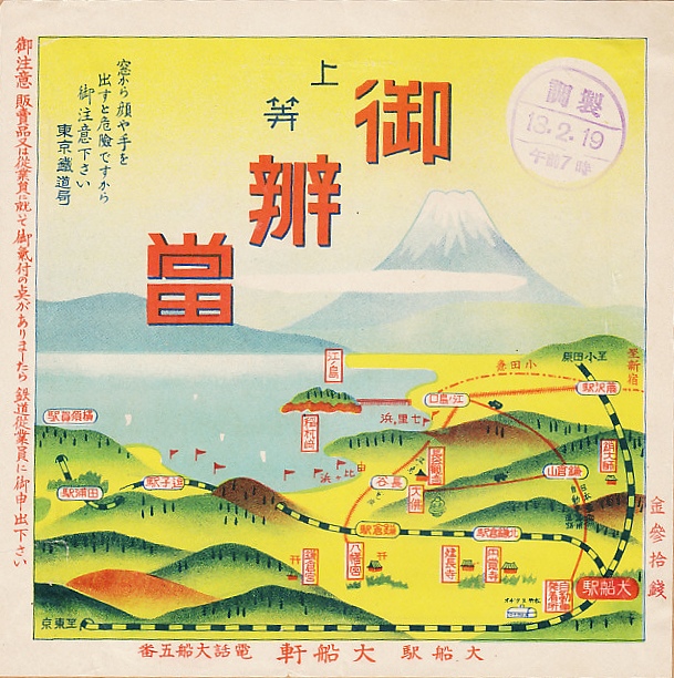 1938(昭和13)年2月19日7時の調製と思われる、昔の大船駅弁の掛紙。富士を背景に大船駅から鎌倉や江ノ島などの行楽地への交通案内を描く絵柄は、下記の1932年8月のものと共通するが、その構図は変えられ、藤沢駅からの江ノ島電車や小田急のルートが図に加わった。