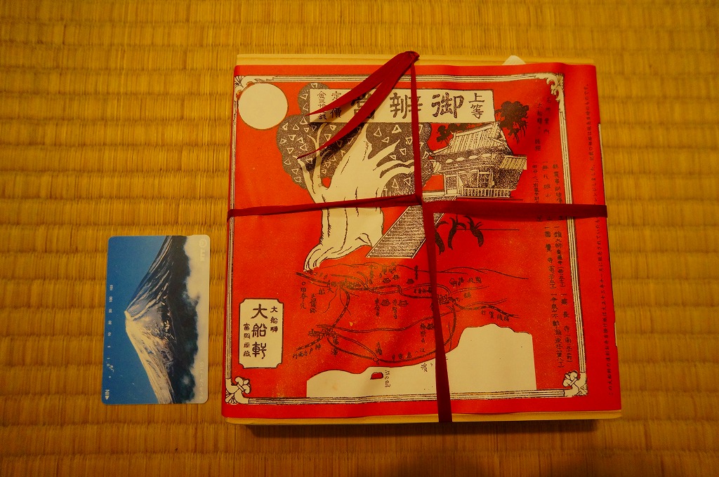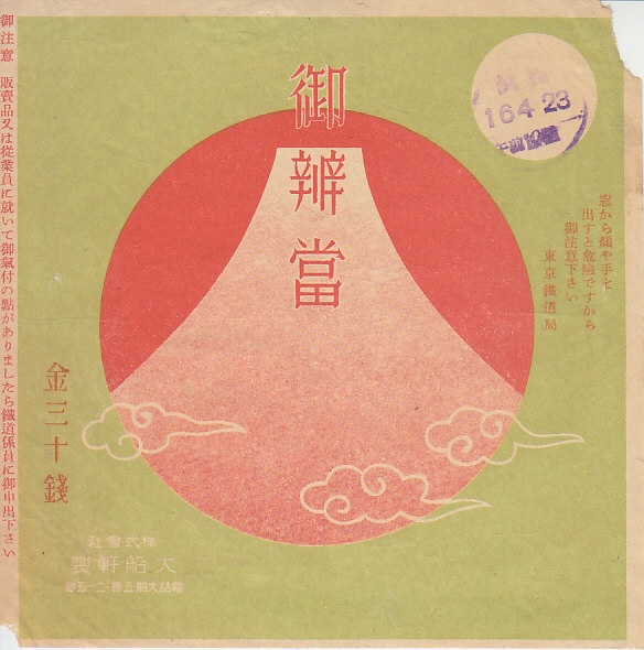 1941(昭和16)年4月23日の調製と思われる、昔の大船駅弁の掛紙。経年劣化かもしれないが、なんともくすんだ富士山を描いたものだと思う。
