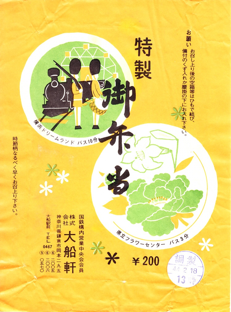1969(昭和44)年2月18日の調製と思われる、昔の大船駅弁の掛紙。絵柄は上記の1970年代のものと変わらない。