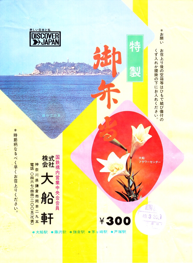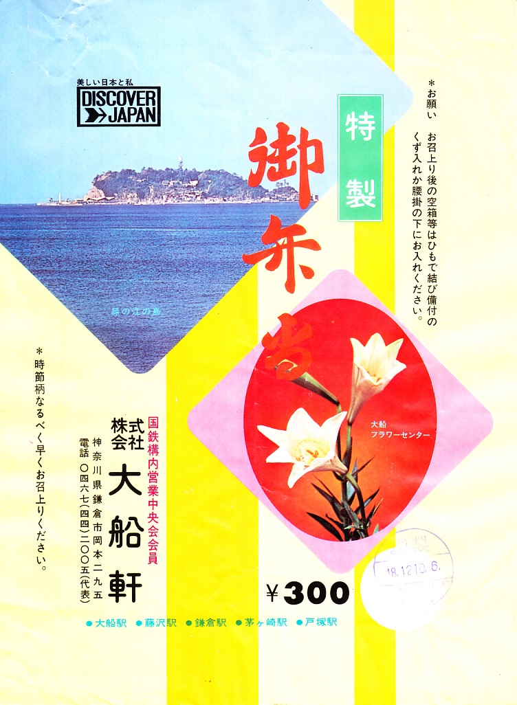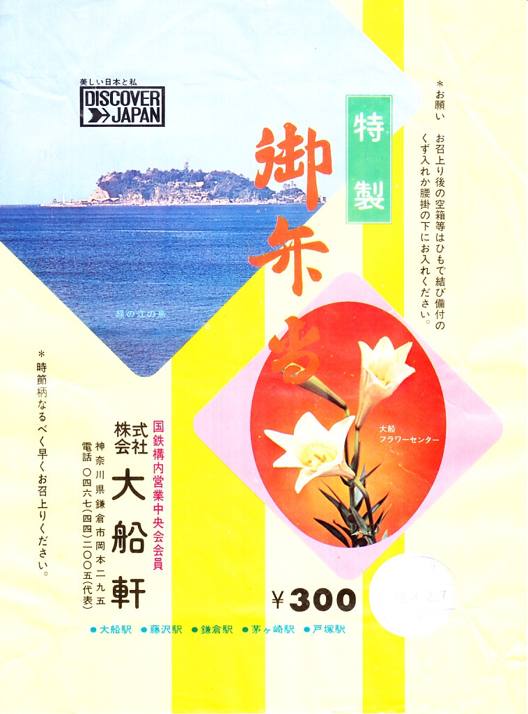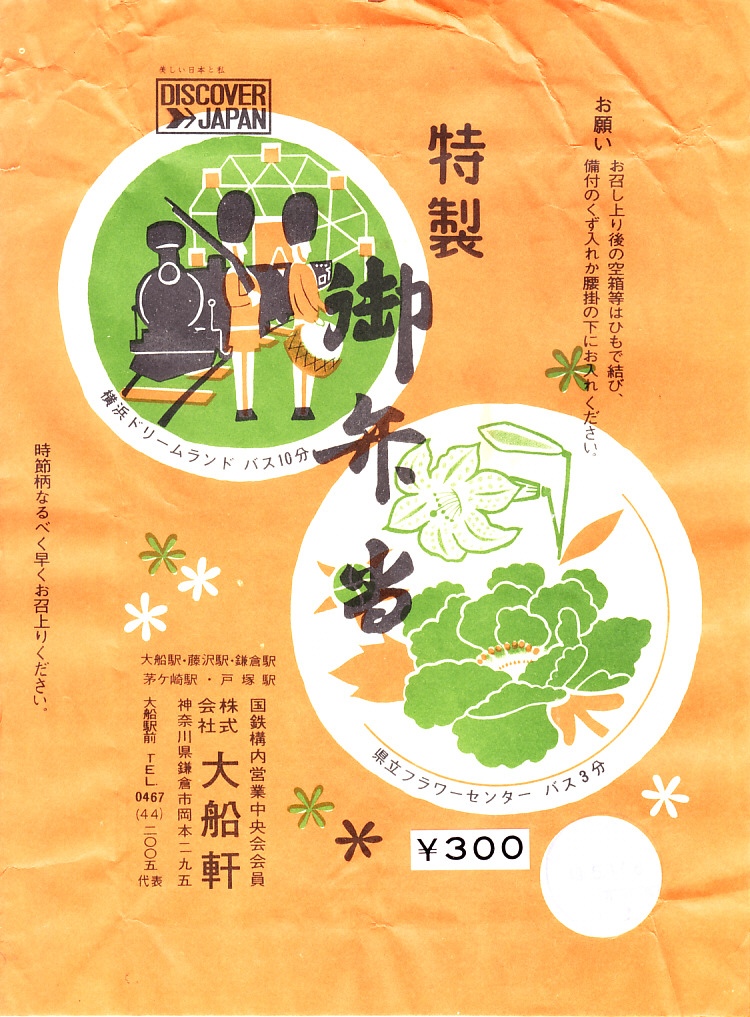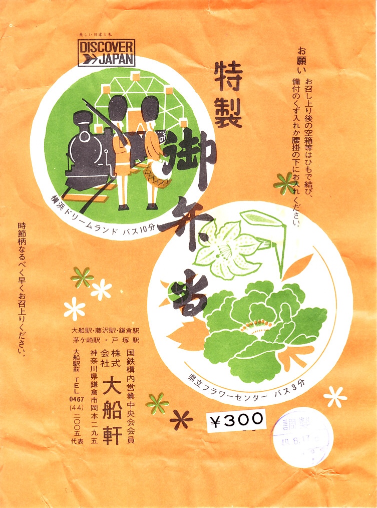 1972(昭和47)年6月18日17時の調製と思われる、昔の大船駅弁の掛紙。駅名の表記と、国鉄の旅行キャンペーン「DISCOVER→JAPAN」のロゴマークの位置を除くと、上記の1973年5月の掛紙「特製御弁当」と、同じ絵柄である。