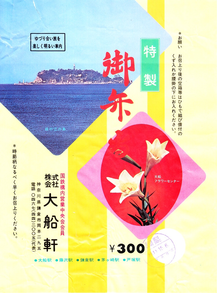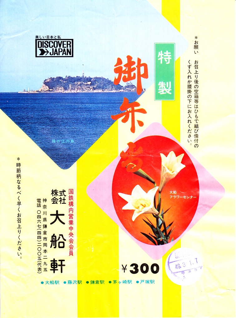 1973(昭和48)年10月20日7時の調製と思われる、昔の大船駅弁の掛紙。「緑の江の島」と「大船フラワーセンター」として、江ノ島とユリの写真を掲載した。同じ日時で3枚もの掛紙を得た。