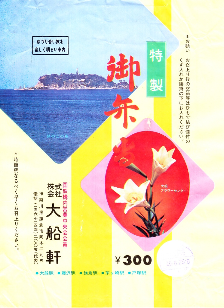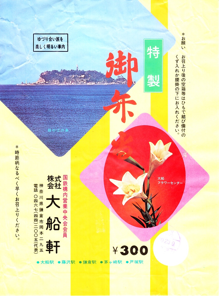 1963(昭和38)年12月30日の調製と思われる、昔の大船駅弁の掛紙。花の絵柄は汎用でなく、県花ゆりとバラ園で神奈川県立フラワーセンターであり、そのアクセスマップも記される。1962年7月に開園し、今も日比谷花壇大船フラワーセンターの名で県有施設として現存する。