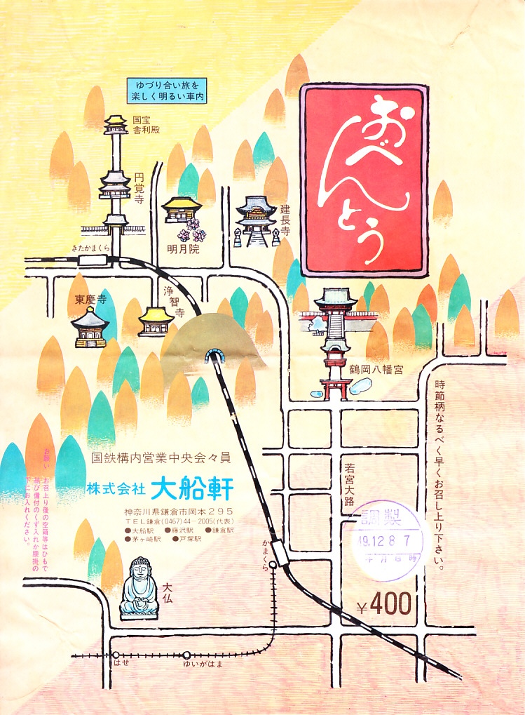 1974(昭和49)年12月8日7時の調製と思われる、昔の大船駅弁の掛紙。鎌倉の地図を大雑把に描く。それでも大仏を除く各名所へのルートは的確に描かれている。同じ日時で2枚の掛紙を得た。