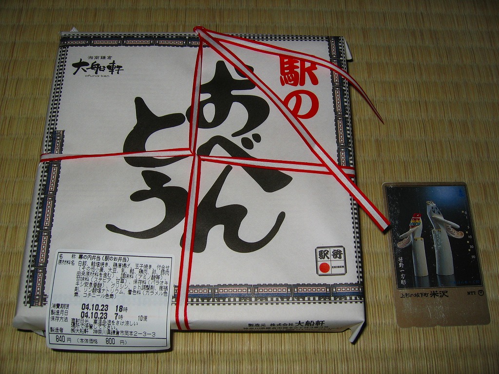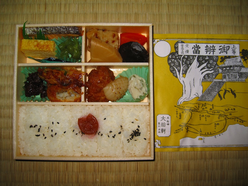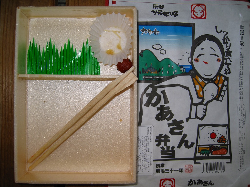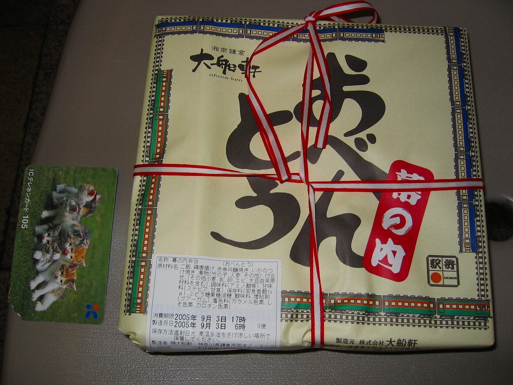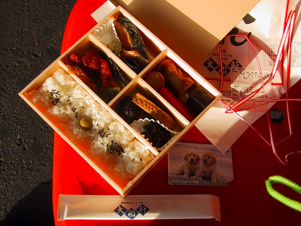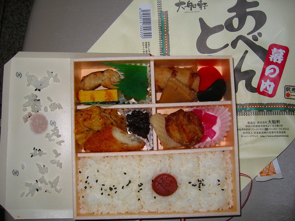 大船駅の普通の幕の内弁当。掛紙をかけて湘南電車の色の紙ひもでしばる長方形の容器の、半分は白御飯、半分はおかずで揚げ焼売・鶏唐揚・白身魚フライ・焼鮭に椎茸等の煮物が入る。御飯は美味く、おかずも身の締まった良い食感。神奈川県、特に大船駅の幕の内弁当は本当に美味い。これを購入した直後の2002年5月に「かあさんの手作り弁当」へリニューアルされた。