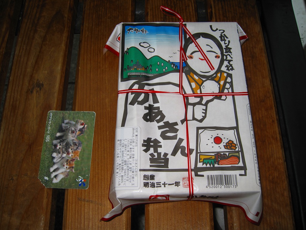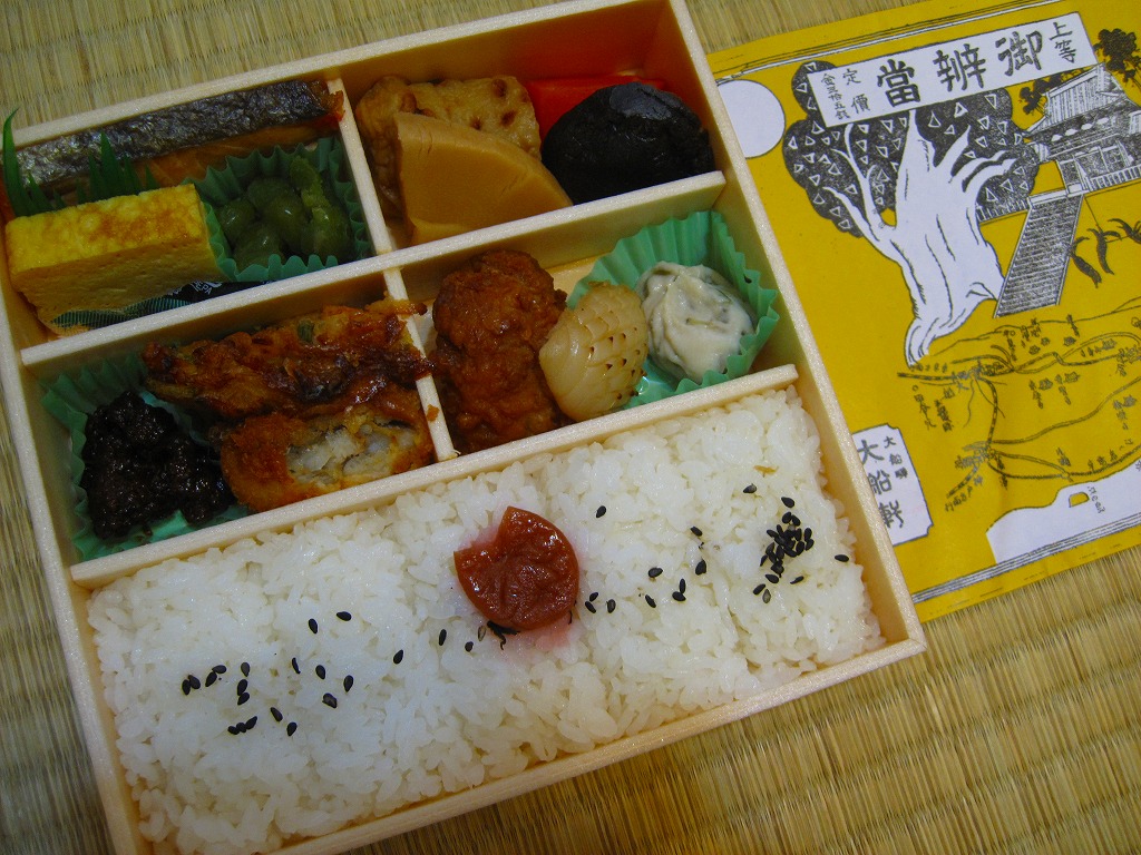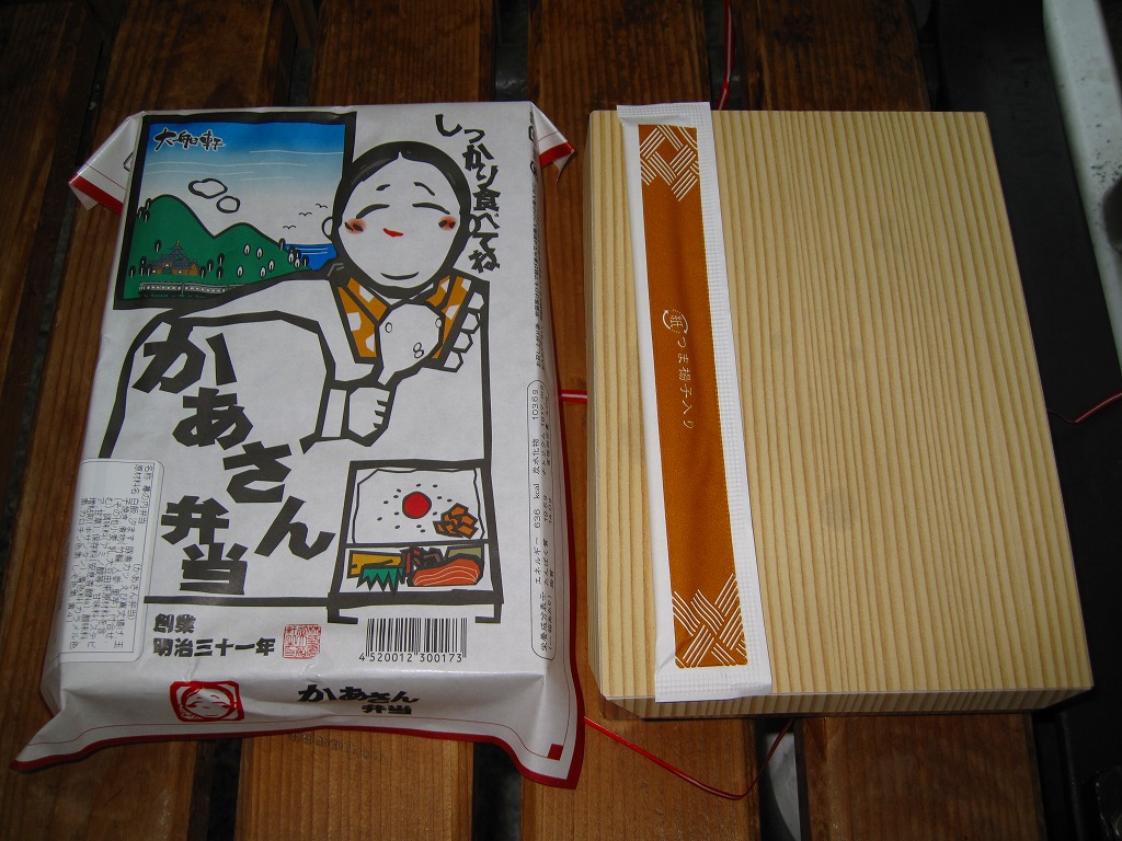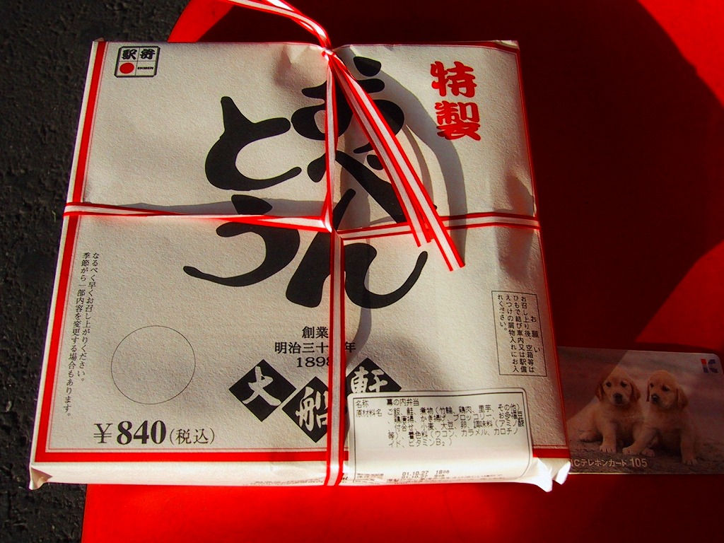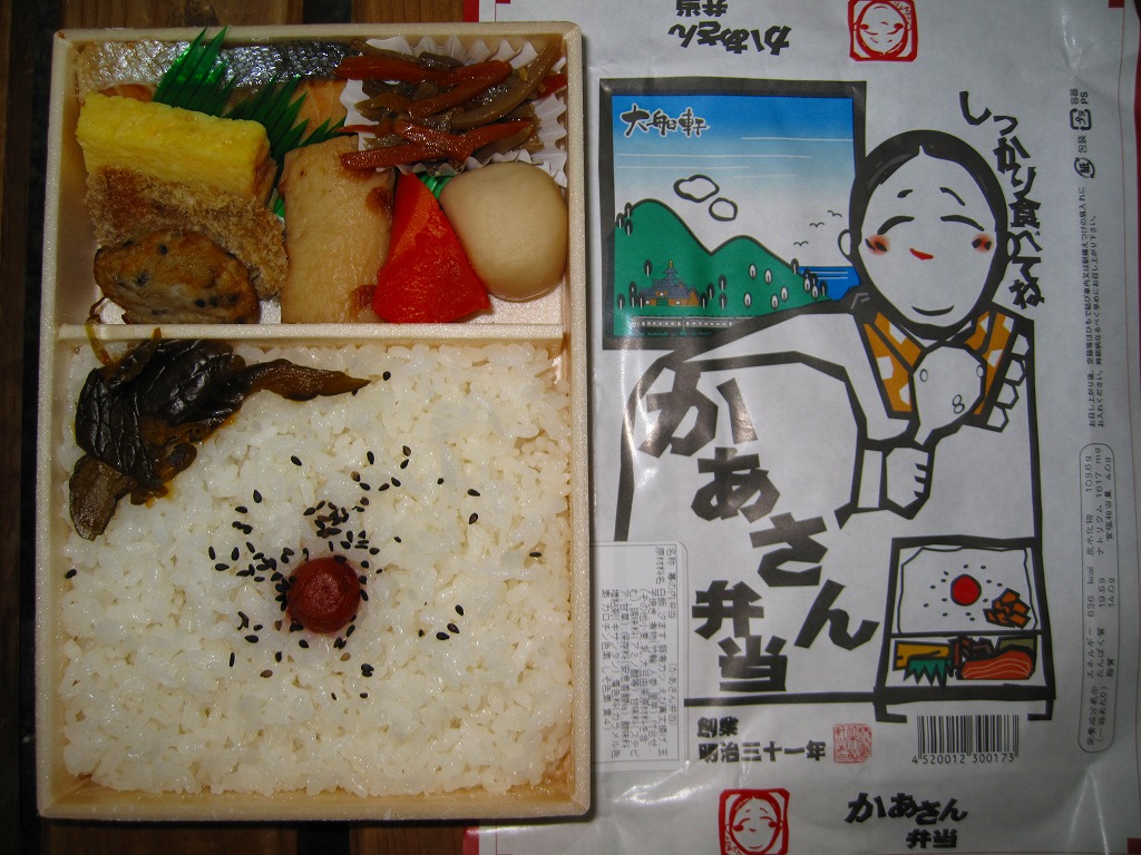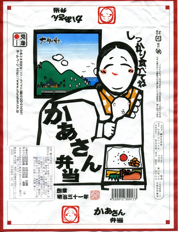 大船駅の普通の幕の内弁当。掛紙をかけて湘南電車の色の紙ひもでしばる長方形の容器の、半分は白御飯、半分はおかずで揚げ焼売・鶏唐揚・白身魚フライ・焼鮭に椎茸等の煮物が入る。御飯は美味く、おかずも身の締まった良い食感。神奈川県、特に大船駅の幕の内弁当は本当に美味い。これを購入した直後の2002年5月に「かあさんの手作り弁当」へリニューアルされた。