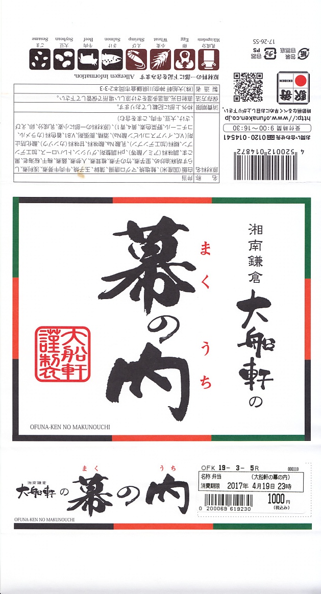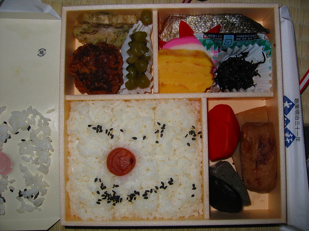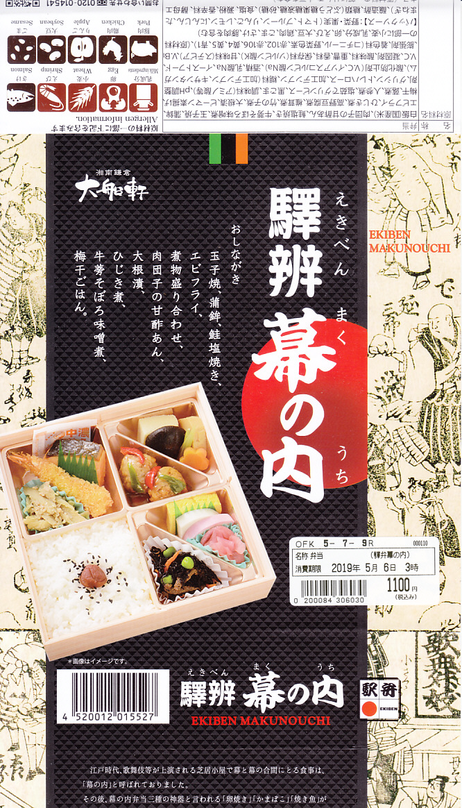 2019(平成元)年1月に発売。おそらく従前の幕の内弁当のリニューアルだろう。大船駅よりはむしろ東京都内の駅弁売店で手広く売られる。幕の内駅弁らしくなく、松花堂タイプの4区画に仕切られた中身は、日の丸御飯、エビフライと鮭塩焼とごぼうそぼろ、肉団子と煮物、紅白のかまぼこと玉子焼にひじき煮と漬物。そんな御飯に三種の神器(焼き魚、かまぼこ、玉子焼)という内容は幕の内駅弁らしい、普段使いの駅弁。過去の大船軒のこのタイプの駅弁よりは、味と盛付に立体感が出たと思う。