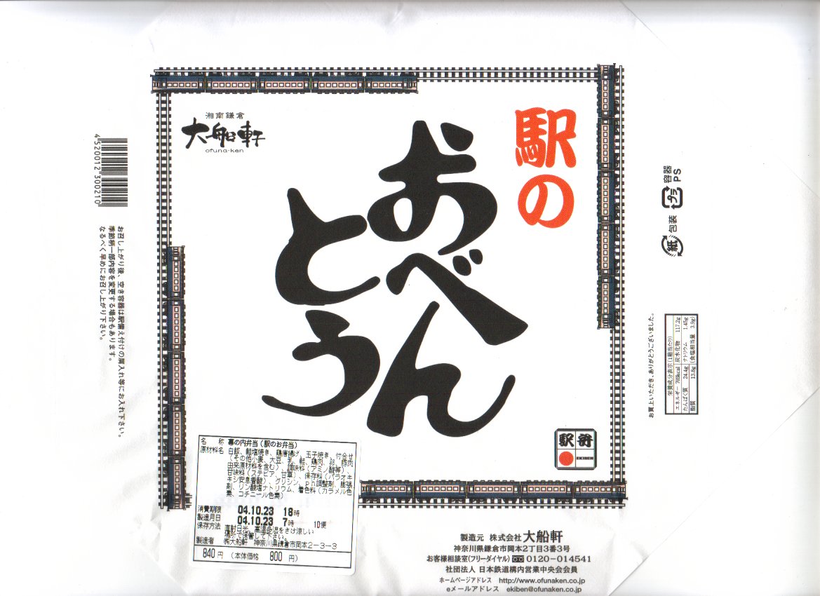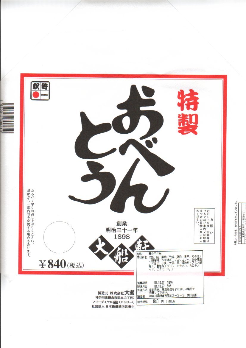 2004(平成16)年の秋頃に、下記の駅弁「特製おべんとう」をリニューアルか。正方形の容器に紙ぶたをして、戦後直後の横須賀線電車を枠に描いた白い掛紙をかけて、紅白の紙ひもで締める。中身は日の丸御飯に鮭塩焼、鶏唐揚、玉子焼、蒲鉾、煮物その他を詰める、いわゆる幕の内駅弁。これも含め最近の大船駅弁は、容器内に無駄な空間が多く容器の底の紙がよく見える、見栄えで損をするものが多いと思う。リニューアル前のほうが良かった感じ。2006年頃までの販売か。