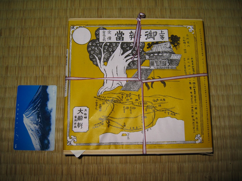 1939(昭和14)年1月8日7時の調製と思われる、昔の大船駅弁の掛紙。その絵柄は下記の1938年2月のものと同じはずが、大船軒の船の漢字が舩になるなど、不思議と文字の形や位置が微妙に異なる。