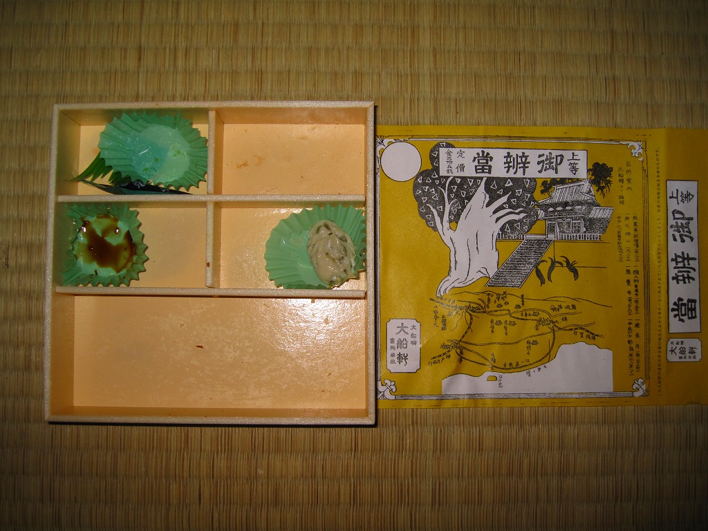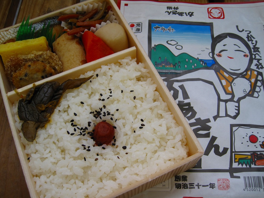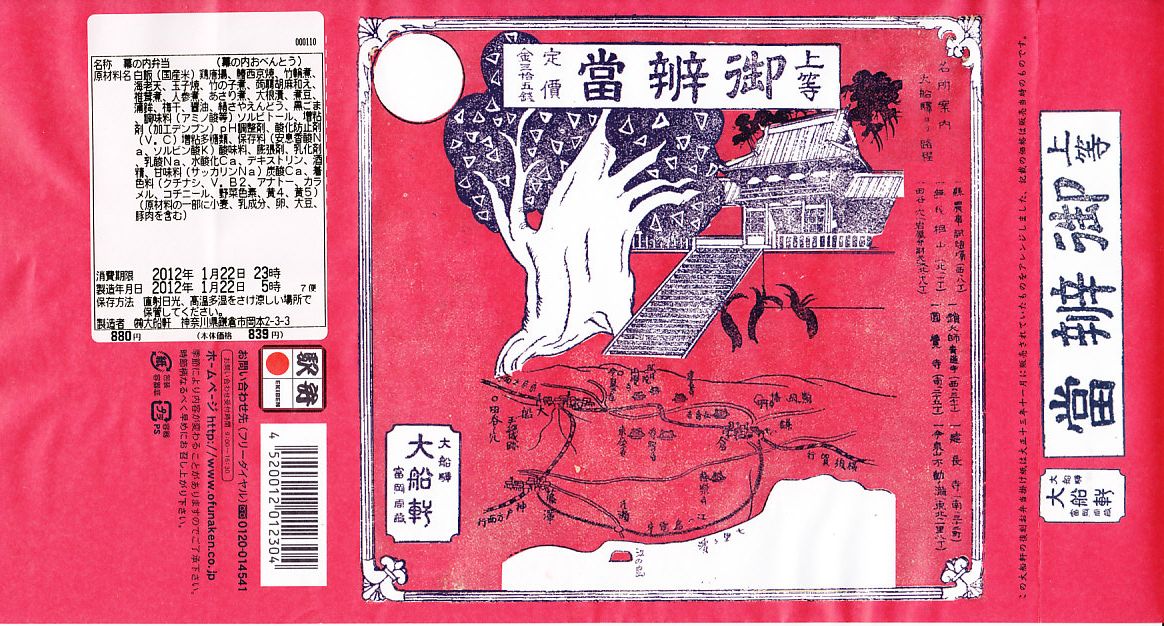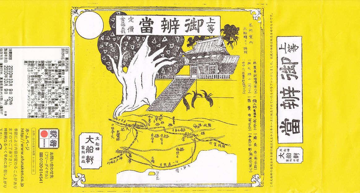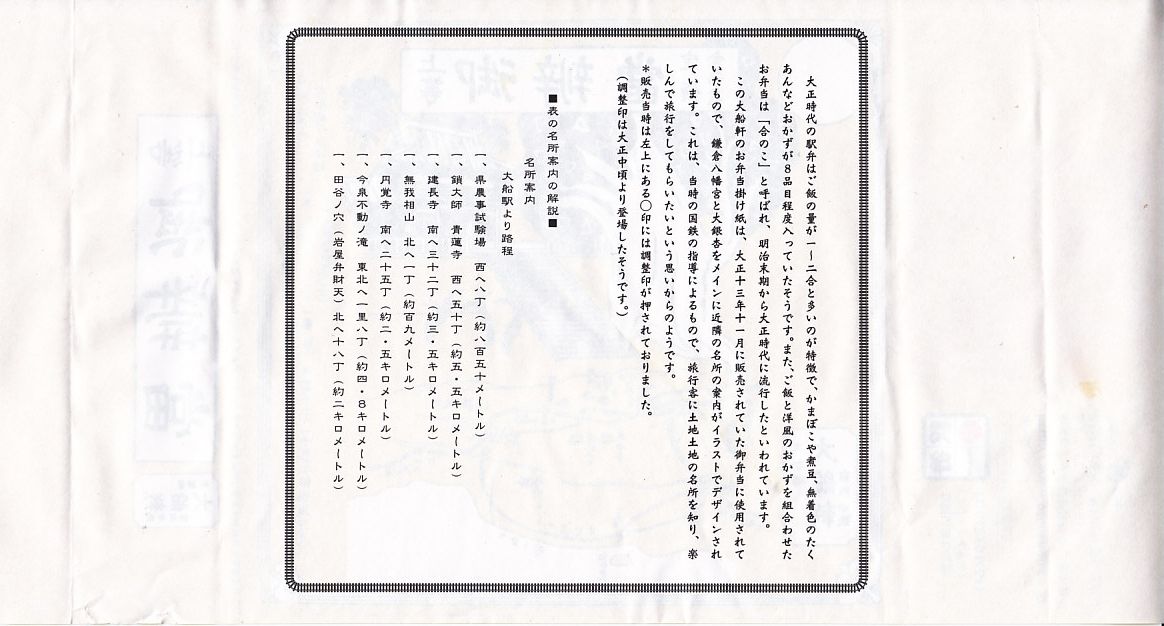 2010(平成22)年10月9日から11日まで東京駅で開催された「第12回東日本縦断駅弁大会」で販売された大船駅弁の復刻商品。といっても復刻したのは掛紙だけであり、中身は普段の大船駅の並等な幕の内駅弁と同じである。掛紙裏面の解説と違い少量な日の丸俵飯に、鶏唐揚とイカ焼とわさび漬、白身魚フライとかき揚げと佃煮、ニンジンとシイタケとタケノコとちくわの煮物、焼鮭と玉子焼とうぐいす豆。掛紙の絵柄は鎌倉八幡宮と2010年3月に倒れた大銀杏。この掛紙が使われた1924(大正13)年当時に比べて、大船や鎌倉の名所はたいして変わっていない。