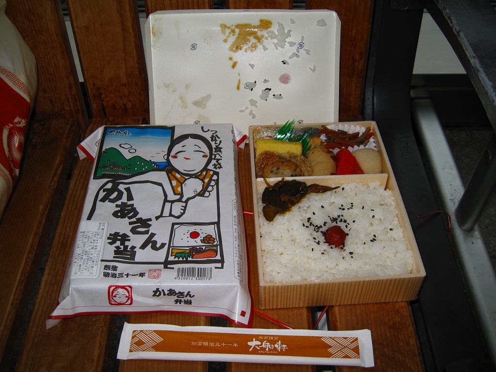 下記の駅弁「かあさんの手づくり弁当」の改訂版か。価格と全体的な雰囲気を変えないまま、名前が短くなり容器は角張り、今回の中身は日の丸御飯に漬物を添え、おかずは汐ます、豚煮カツ、えび真丈揚げ、玉子焼、きんぴらごぼう、ちくわなどの煮物。おかずの内容は時々変わる模様。コンセプトは昭和30年代のおふくろの味なのだそうな。そうかな、とは思うけれど、手作り感とお買い得感のある、地味が好ましい幕の内駅弁。2012年までに終売か。