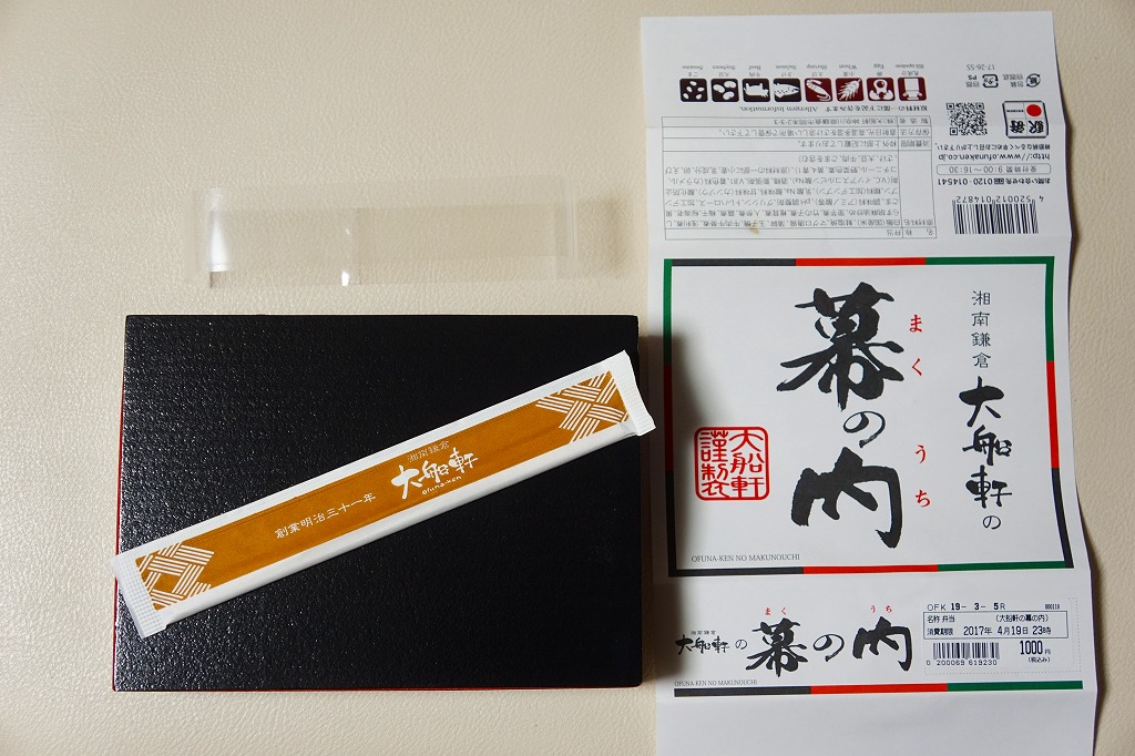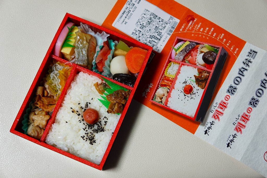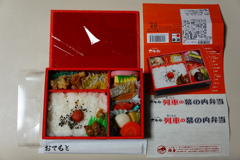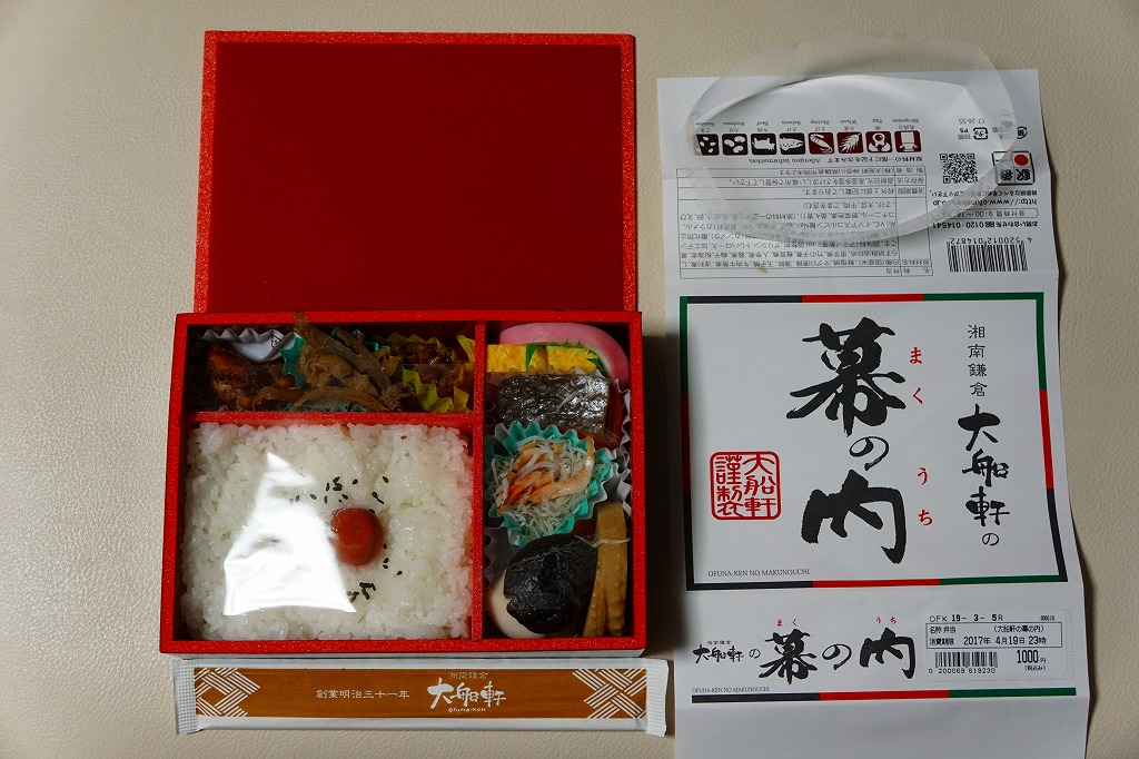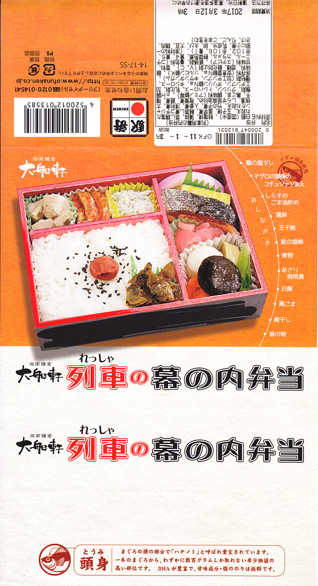今回購入したものは、レシートに「列車幕の内第2弾」とあったので、過去に第1弾が存在した模様。中身の写真を使う掛紙に、列車の停車駅案内のようにおしながきを記す。中身は日の丸御飯にアサリ時雨煮、焼鮭とかまぼこと玉子焼、蒸し鶏とマグロのコチジャンとシラス炒め、サトイモやシイタケなどの煮物と漬物。大船駅弁や大船軒らしさのない、普通の幕の内駅弁。2016(平成28)年の夏までに、上記の駅弁「湘南鎌倉大船軒の幕の内」へリニューアル。