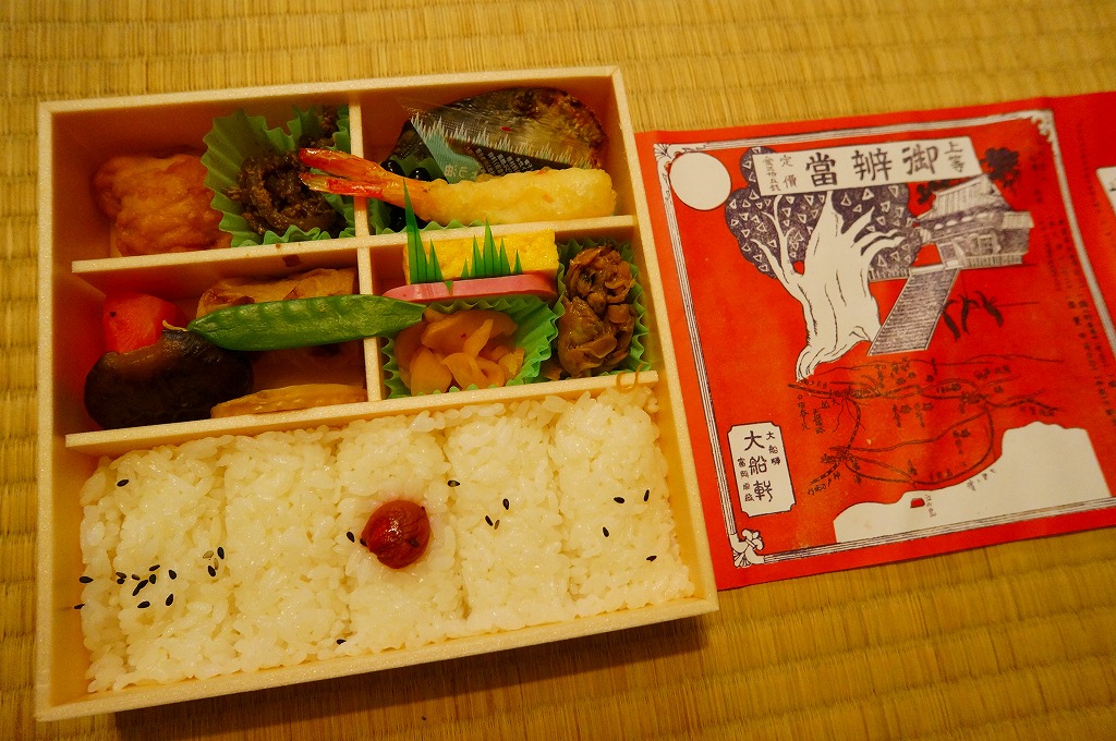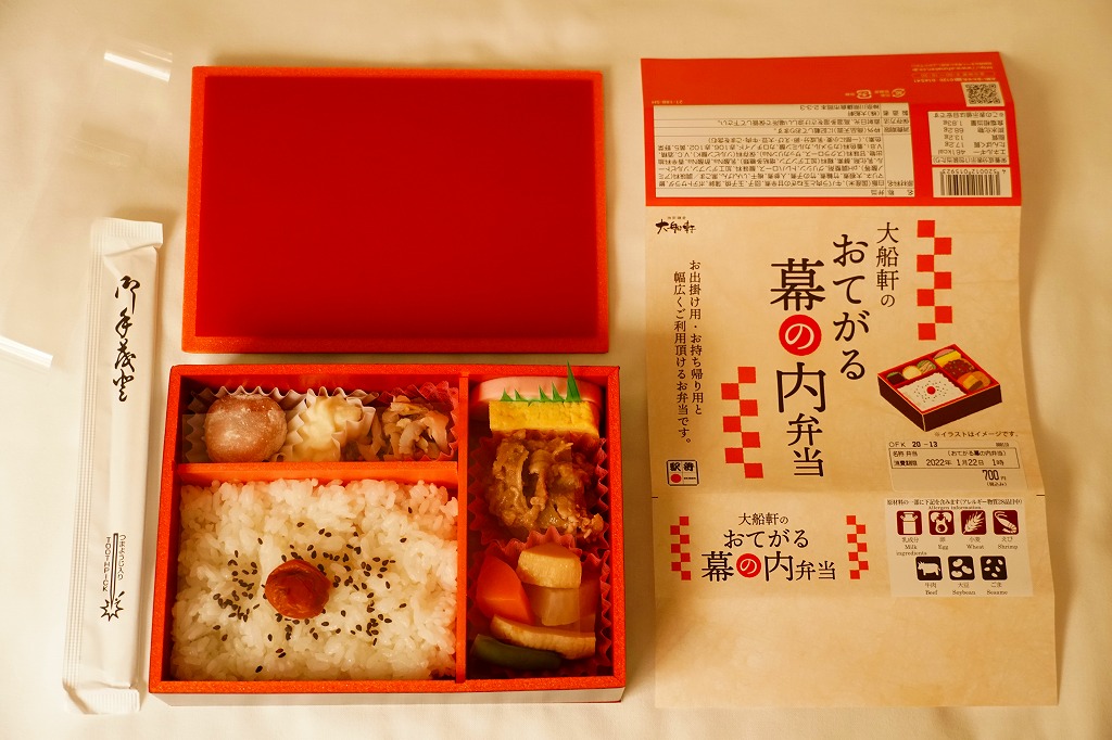 大船軒の幕の内弁当。厚手の紙の掛紙をかけた正方形の容器は5区画に仕切られ、梅干しを載せた俵飯が5つ、鮭に鶏唐揚、揚げ物煮物各種に付け合わせと、品名「幕の内弁当」のとおりの正統派の幕の内弁当。赤と白の外観が印象的で、しっかりした内容物も好感が持てた。