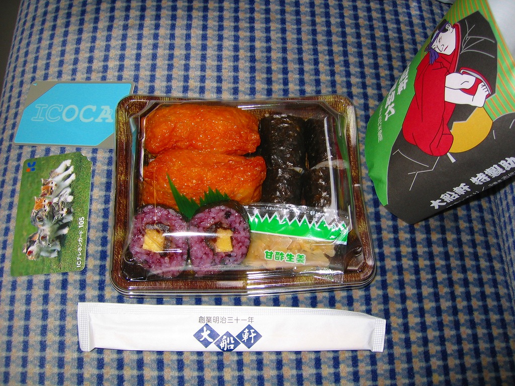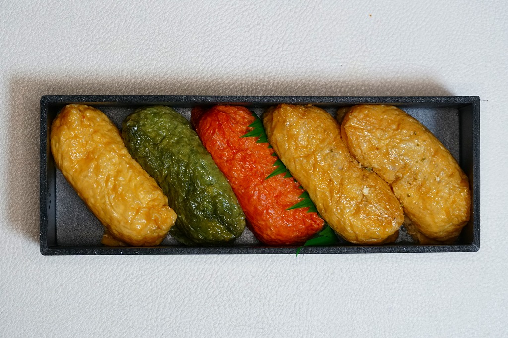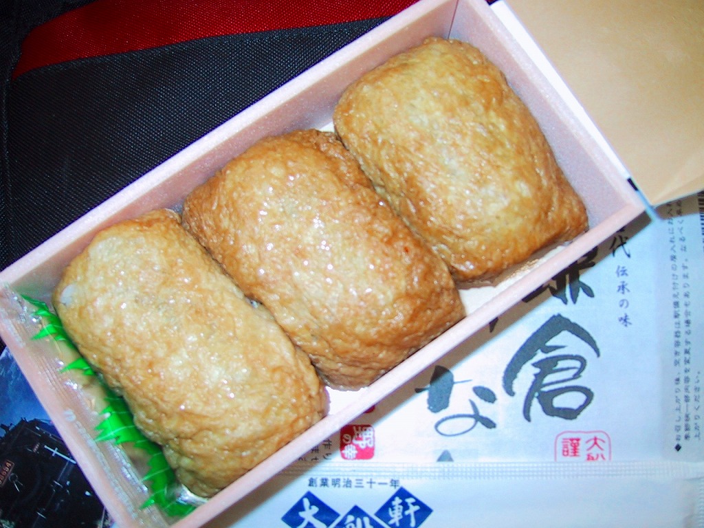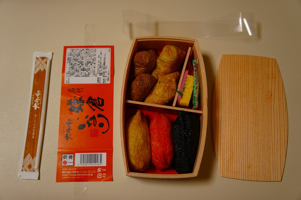 2010(平成22)年夏のリニューアル。薄い木に紙を貼り合わせた小さな長方形の容器に透明なふたをして、駅弁の名前を書いた紙帯を締める。中身は抹茶いなり、黒いなり、青菜ゆずいなり、味噌いなり、一味唐辛子風味いなりが各1個と、アジと甘酢生姜の和え物。中身がスカスカだけれども、この容器であればあまり気にならない。なかなかおしゃれで味もきれいな軽食。いつの間にか上記のものへリニューアル。