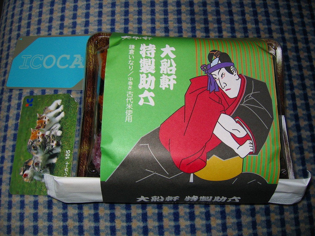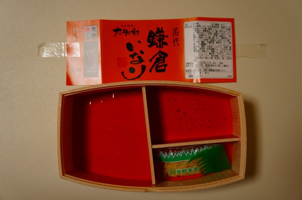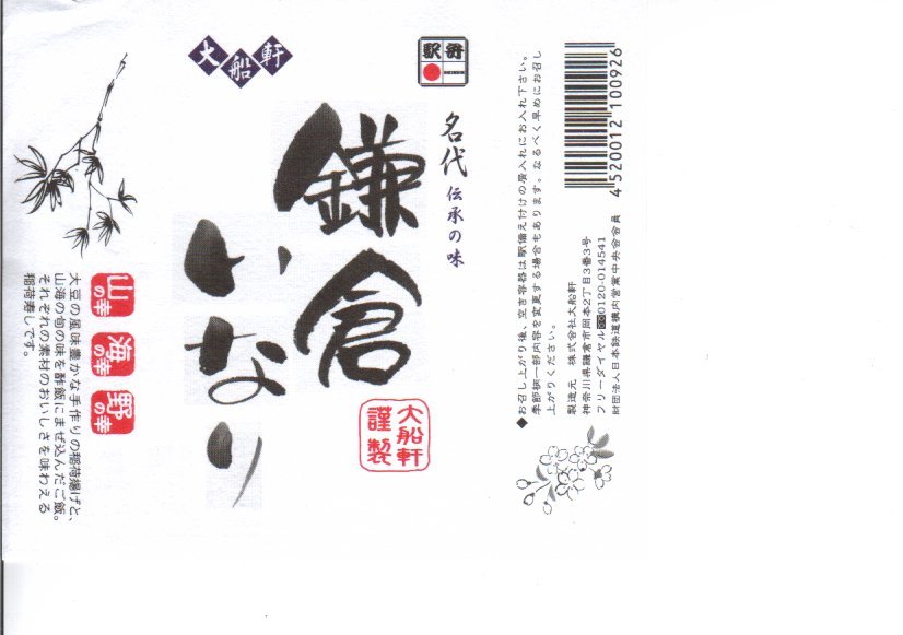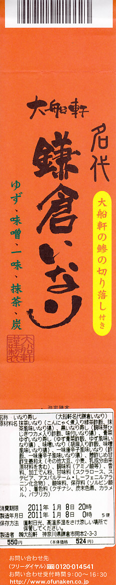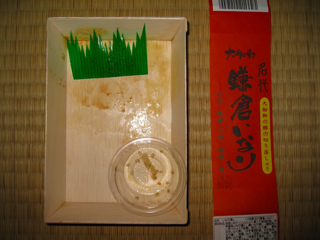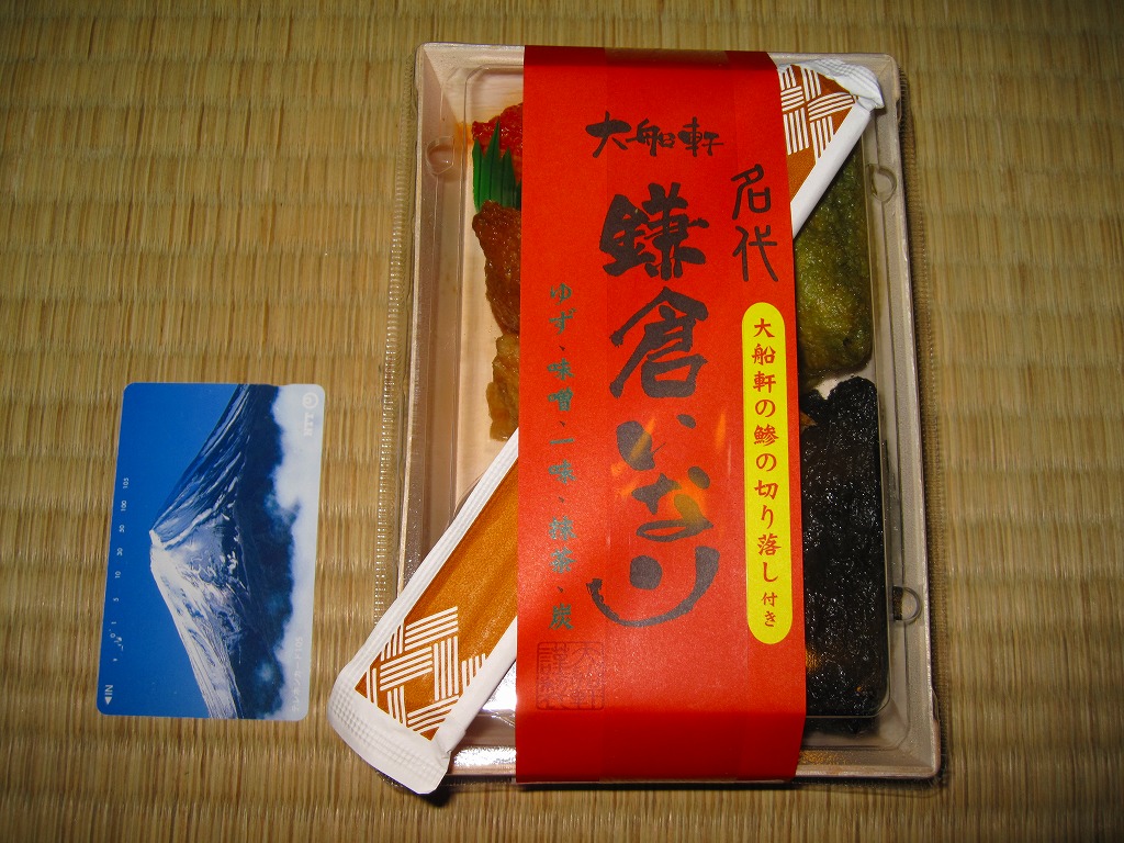 下記の駅弁「名代鎌倉いなり」の、2012(平成24)年の秋時点での姿。名前と趣旨は変わらないようだが、容器が惣菜向けから駅弁向けの樽形平面な発泡材製に変わり、掛紙が縦長から横長に変わり、5種のおいなりさんのうちゆず青菜と黒糖の2種の形状が変わっている。味は以前から良く、これで見栄えもさらに良くなった。この年限りの販売か。