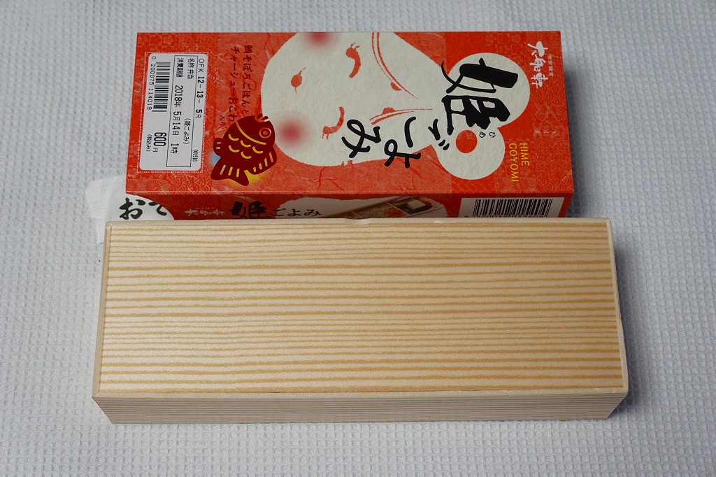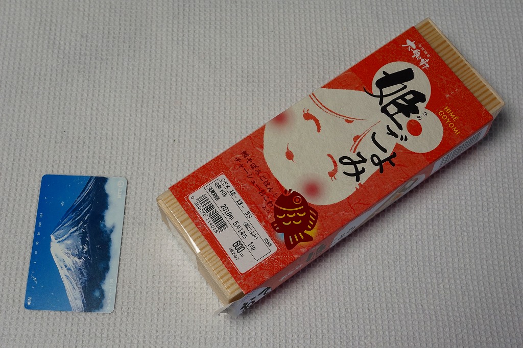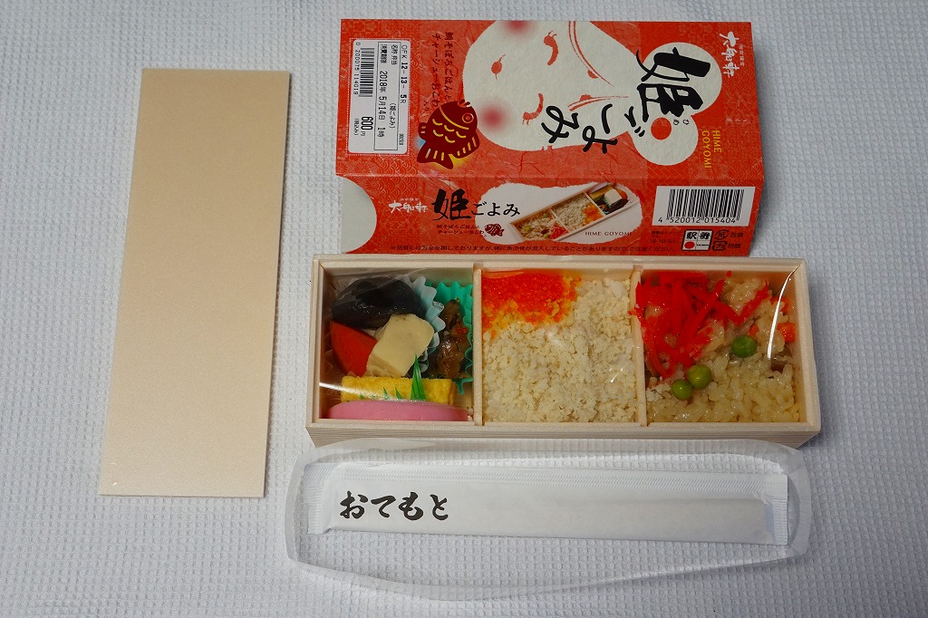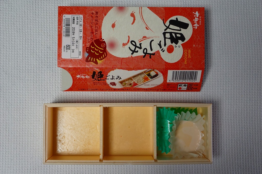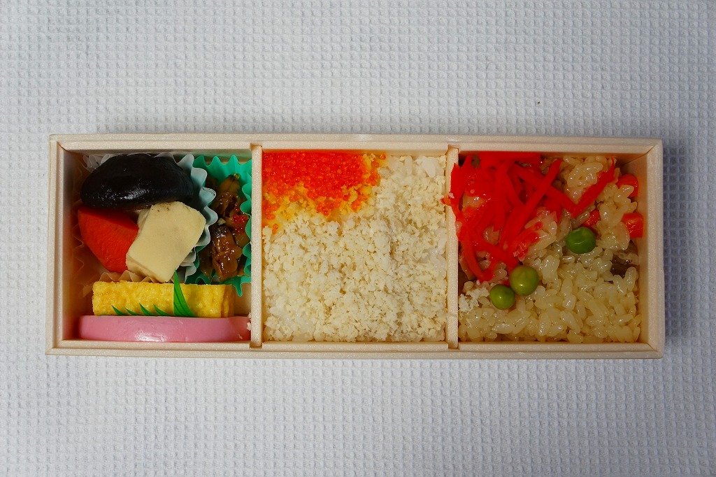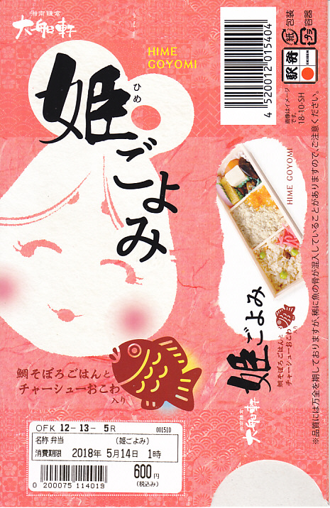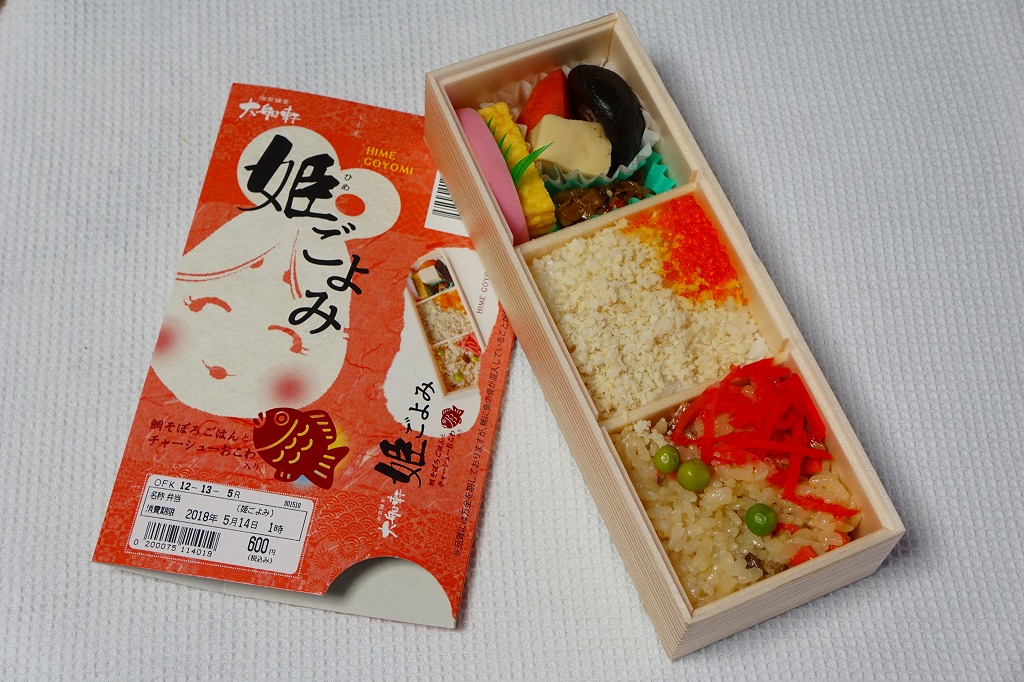 2018(平成30)年3月の発売か。小さな正方形3つ分の縦長の容器を、ピンク色のスリーブに収める。中身はやはり正方形3区画で、チャーシューおこわと紅生姜、鯛そぼろごはんとトビッコ、かまぼこと玉子焼と煮物とアサリ煮。弁当として食べればなんてことなくも、コンビニやデパ地下の軽食にはない組合せと見栄えで、駅弁と多様性がアピールできていると思った。「諸般の事情により9月17日(月)をもって製造販売を中止」とのことで、半年で終売。