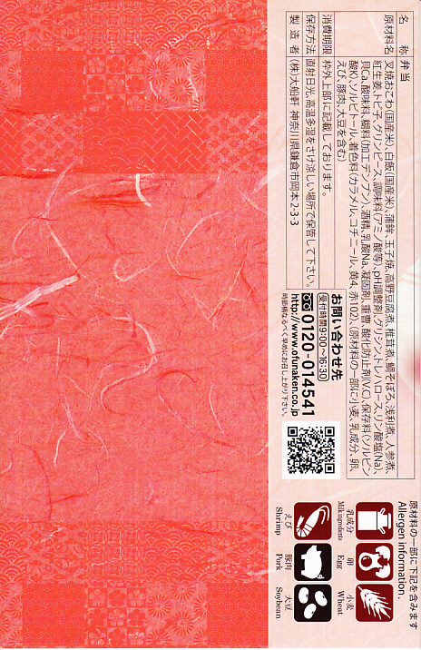 2015(平成27)年の秋までに発売。調製元は大船駅の駅弁屋であり、市販の時刻表などでは大船駅の駅弁としているが、実態はJR東日本の東京エリアや車内販売で売るための商品なのだろう、ネット上の収穫報告は新幹線の車内販売ばかりで、今回の購入箇所も大船駅と何ら関係のない中央線特急列車の車内である。