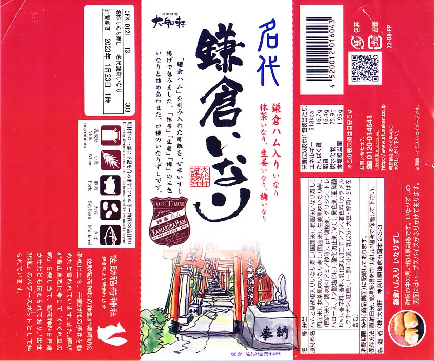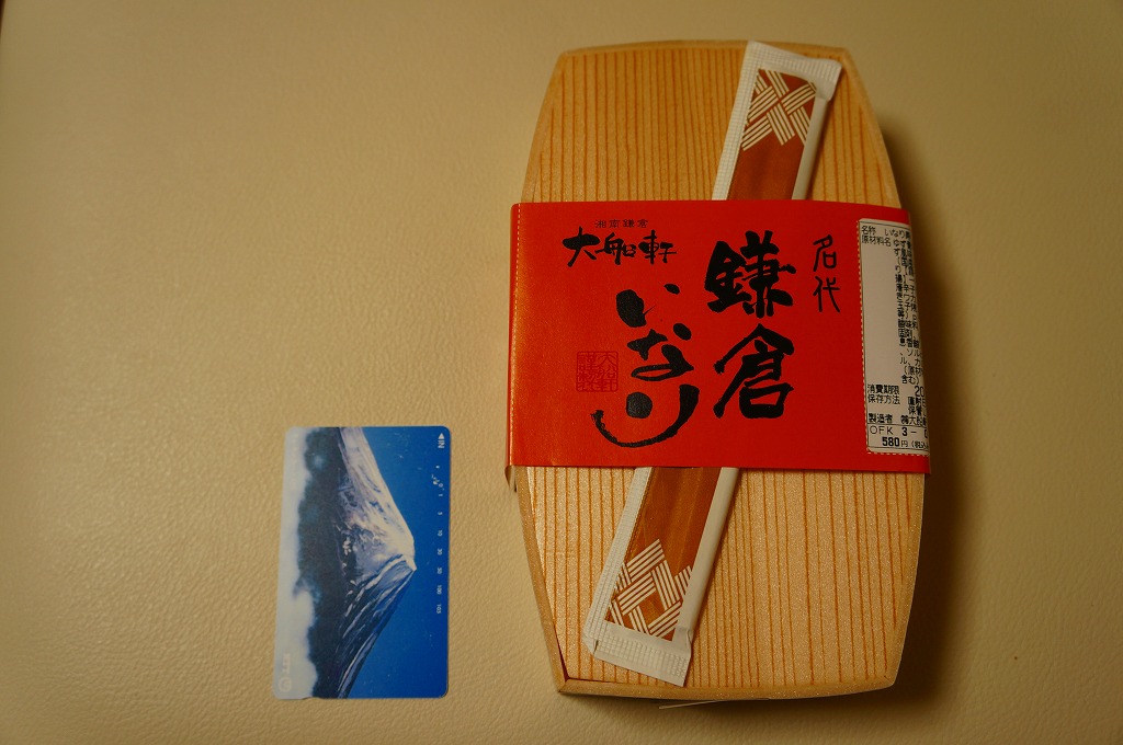 下記の駅弁「名代鎌倉いなり」を、2022(令和4)年10月までにリニューアル。容器は細身になったが、価格と掛紙の絵柄が据え置かれたため、変更に気が付かなかった。中身は引き続きおいなりさんでも、同じ色の3個が小さな5個に変わり、鎌倉ハム入りいなり2個、抹茶いなり、生姜いなり、梅いなりの構成となった。味は引き続き、それぞれほぼ変わらないと思うが、見た目の色が違うので、香りも違う気がしてくる。2023年4月に大船軒がJR東日本クロスステーションに吸収合併され、大船の調製所が廃止されたため、その2023年5月限りで終売。