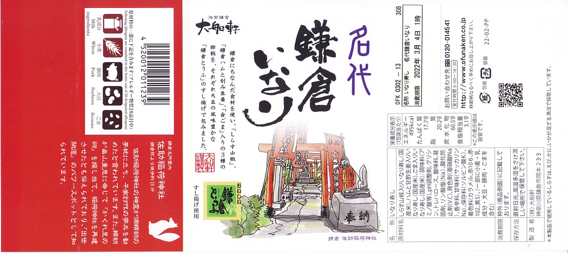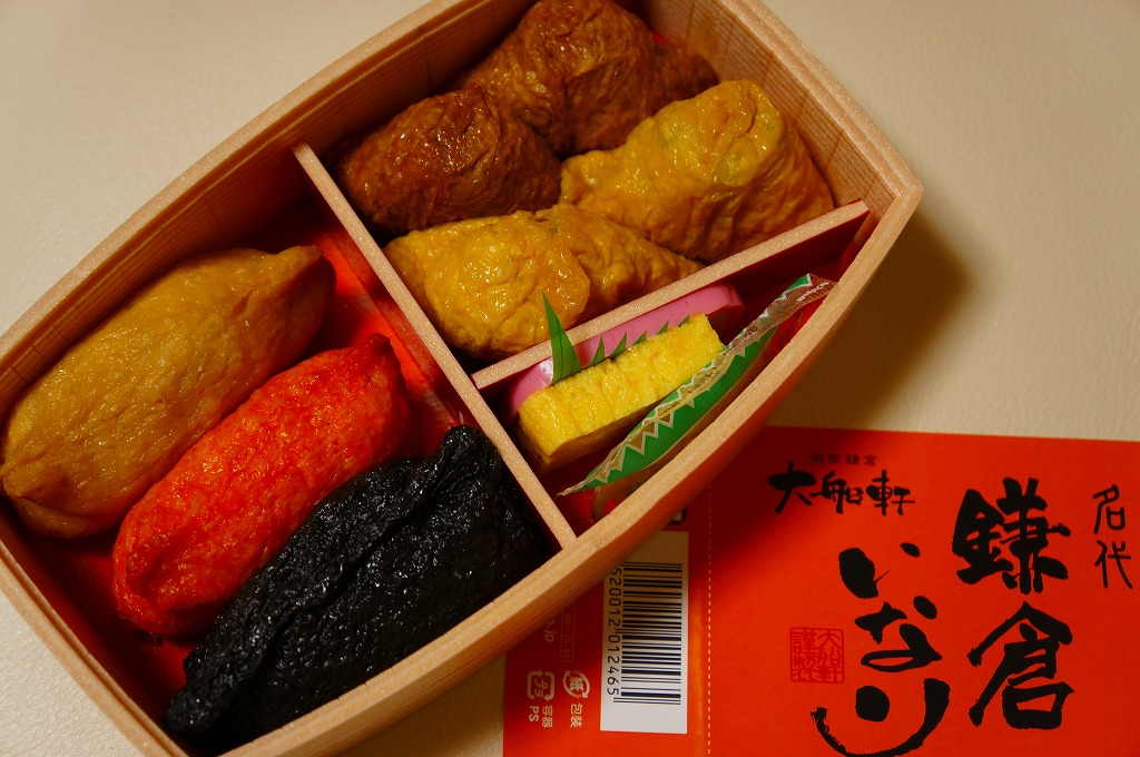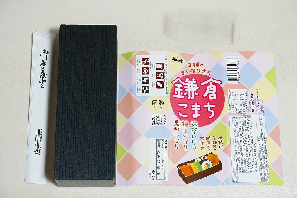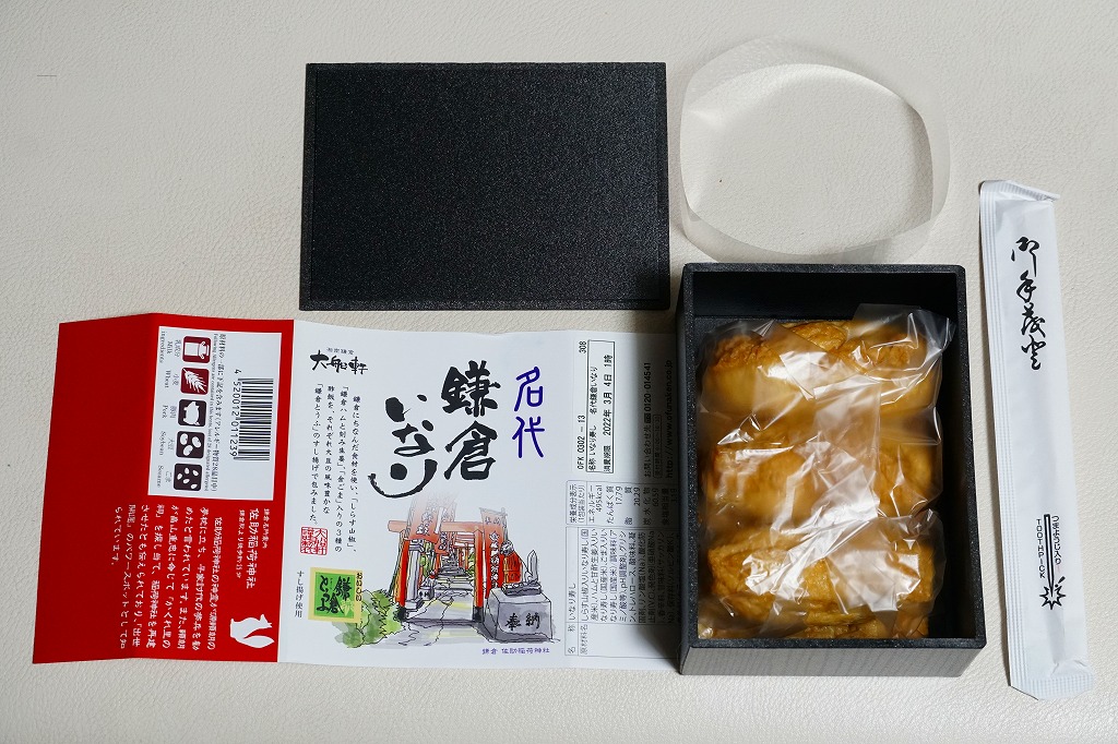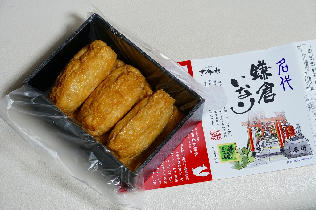 2022(令和4)年の2月までに発売か。黒い小箱に稲荷寿司を3個詰め、商品名に宣伝文や鎌倉佐助稲荷神社を描いた掛紙を巻く。おいなりさん3個の中身はすべて異なり、しらす山椒入り、ハムと甘酢生姜入り、ごま入りとなるが、食べても分からないくらい、同じ味をしていた。口当たりは柔らかく、味付けはしっかり。大船駅弁の稲荷寿司は、下記のとおり過去十数年間ほど様々な姿を模索しており、ここにきて2000年代の姿に戻ったようだ。2022年10月までに上記の「名代鎌倉いなり」へリニューアル。