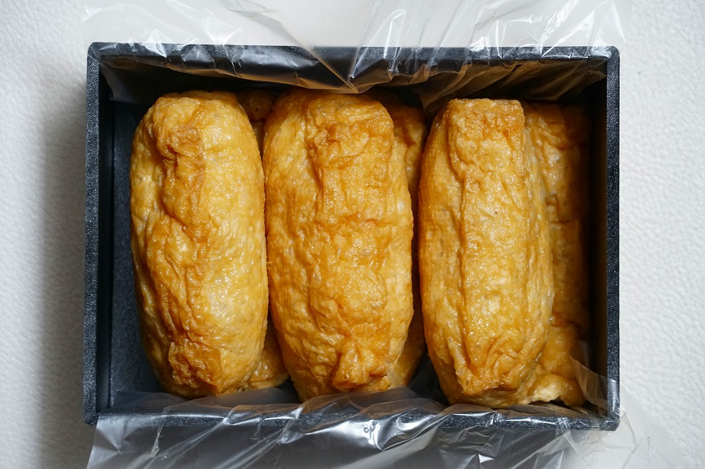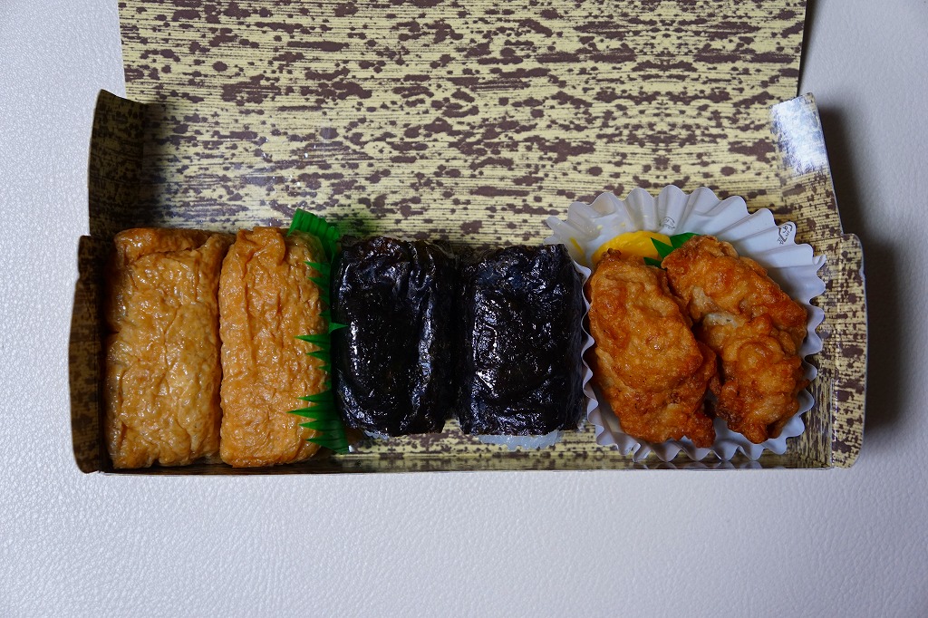 小柄な長方形の容器に、丸みがあり形の良いいなりずしが3個入る。中身はすべて異なり、ひとつは野の幸きんぴらごぼう、ひとつは山の幸わさびめし、ひとつは海の幸いりこ菜めしで、これは夏バージョンとのこと。一個あたり120円でこれだけ良い味なのだから、大船駅で同じ値段のコンビニおにぎりを買ってはいけない。