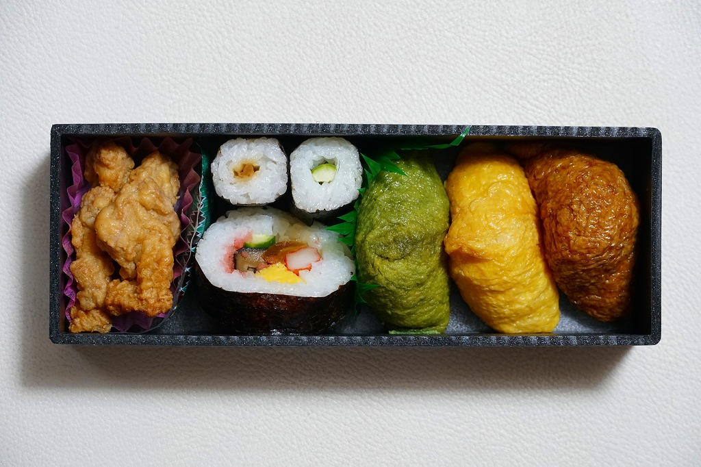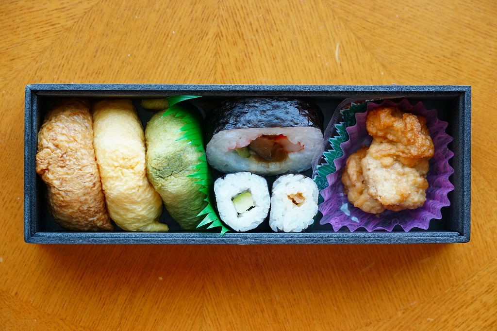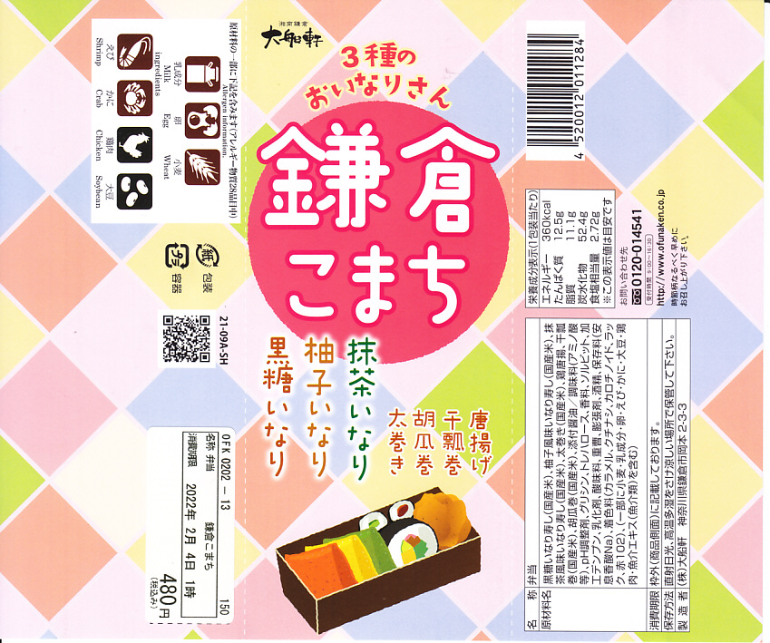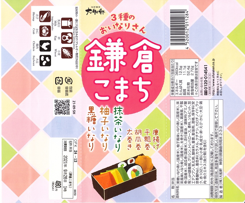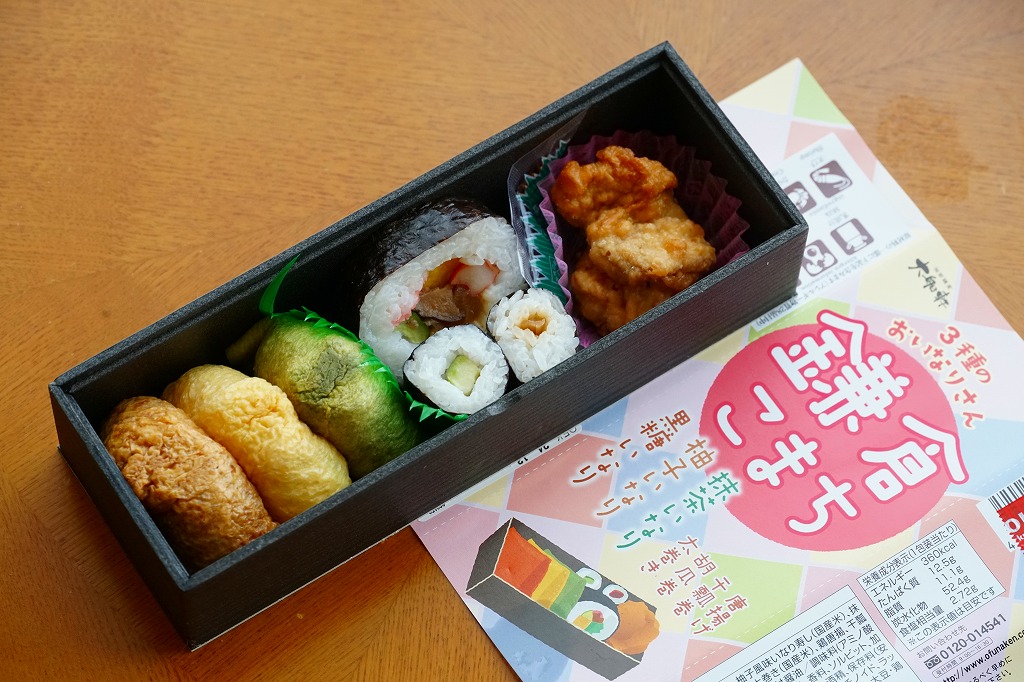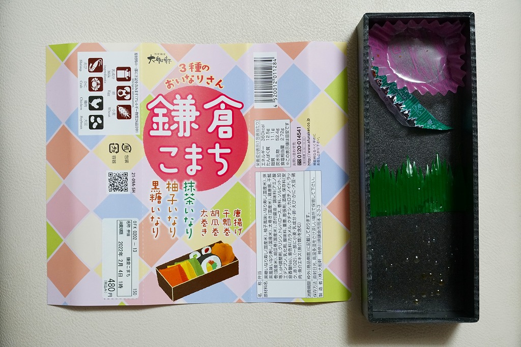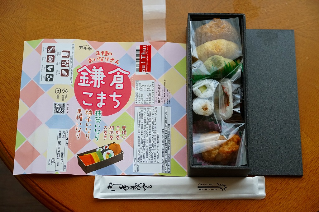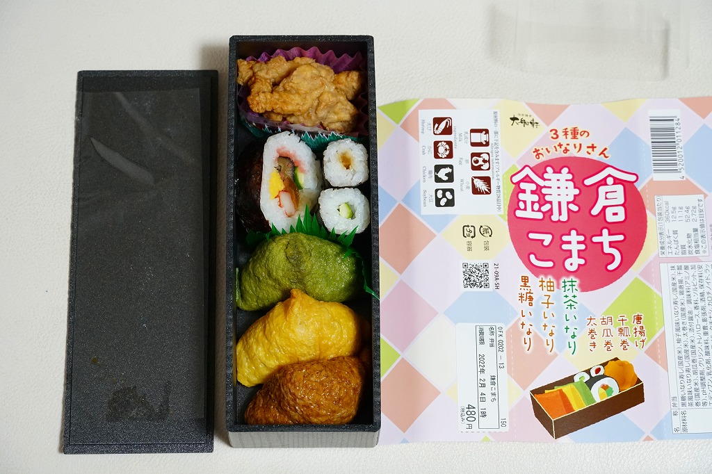 2021(令和3)年7月から8月まで販売された記念駅弁「E235(鎌倉こまち)」(500円)が、9月に掛紙を替えて20円値下げして売り続けられたものと思われる。中身は掛紙にイラストと文字で紹介されるとおり、黒糖いなり、柚子いなり、抹茶いなりでお揚げが3色の三角いなり、太巻き1切れ、胡瓜(きゅうり)巻の干瓢(かんぴょう)巻の細巻き各1本、鶏の唐揚げ2個。値段も分量も風味も軽く、買いやすく食べやすい。2022年6月頃までの販売か。