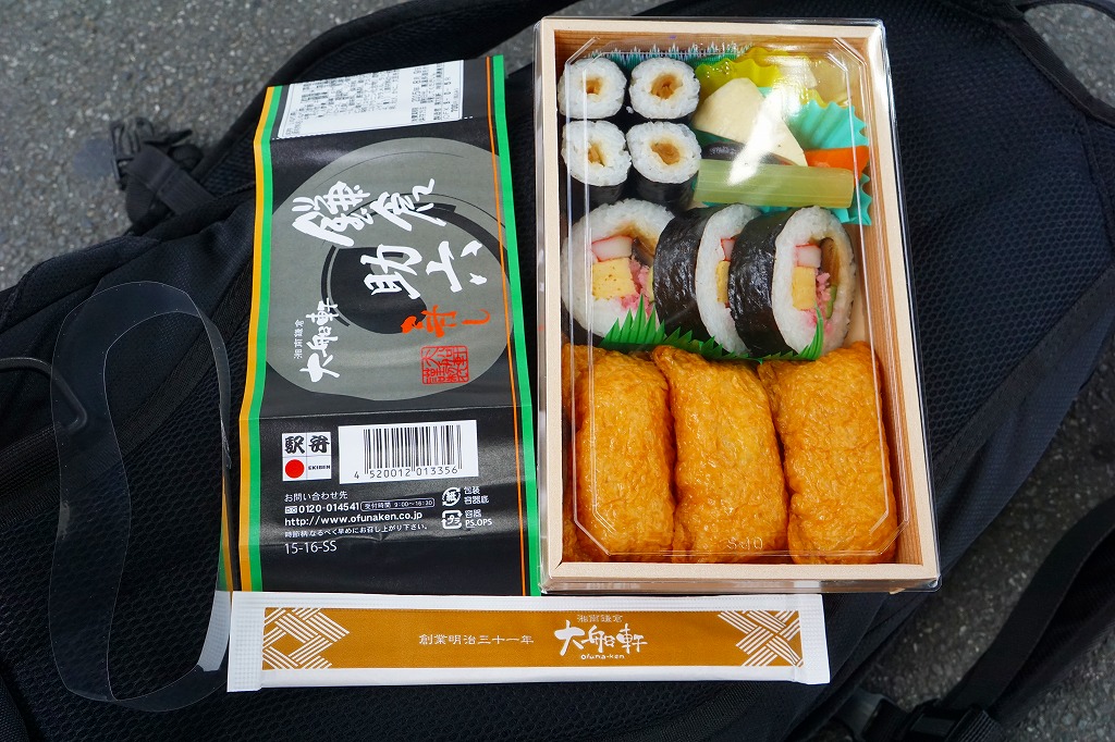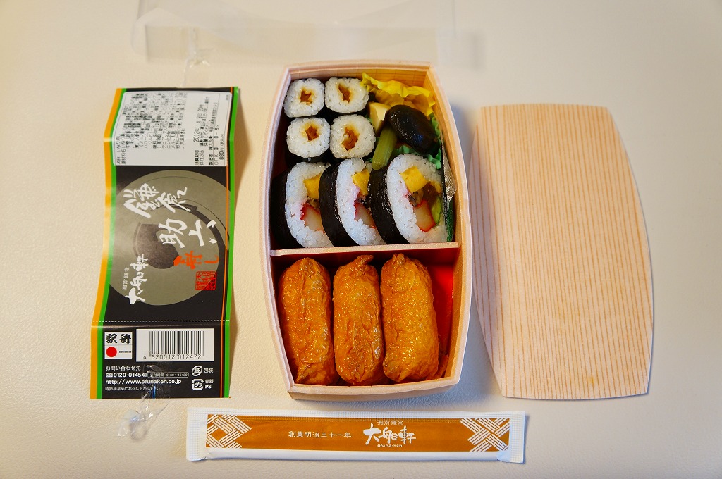 2016(平成28)年に500円で発売。「大船軒のすけろく」というから大船駅の駅弁に見えるが、実態は東京駅など首都圏の駅弁屋で売られる商品で、親会社の日本レストランエンタプライズ(NRE)の駅弁群の一翼を担うもの。スリーブの写真のようなイラストのとおり、中身はいなりずし3個、太巻き3切れ、きゅうりとかんぴょうの細巻きが各2本という、文字通りの助六寿司。昭和時代に「普通」の駅弁と定義された定番の内容も、この内容で現存する令和の駅弁はほとんどない、実は貴重な存在。価格は2019年時点で600円、2023年時点で700円、2025年2月から750円。大船軒は2023年4月にJR東日本クロスステーションへ吸収され、調製所も埼玉県戸田市へ集約された。