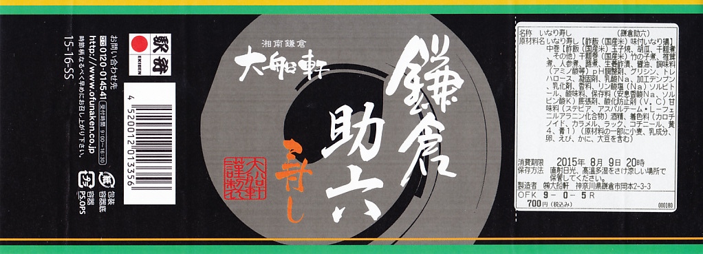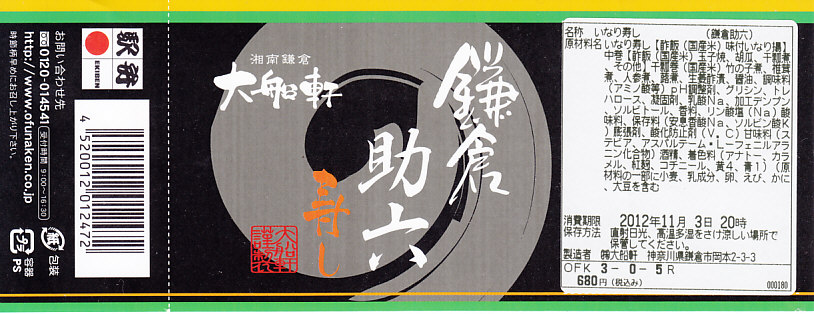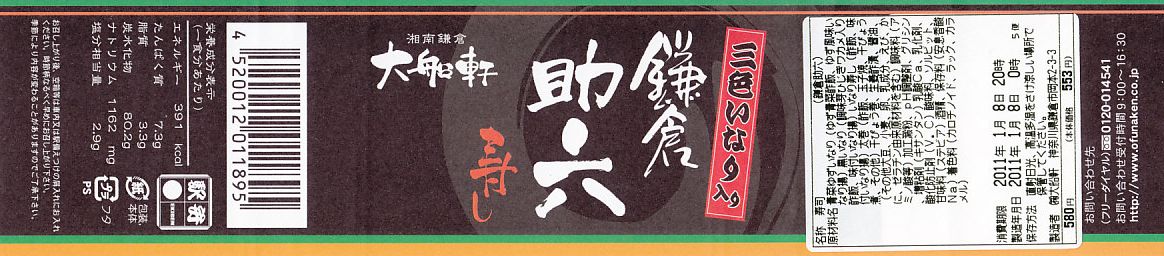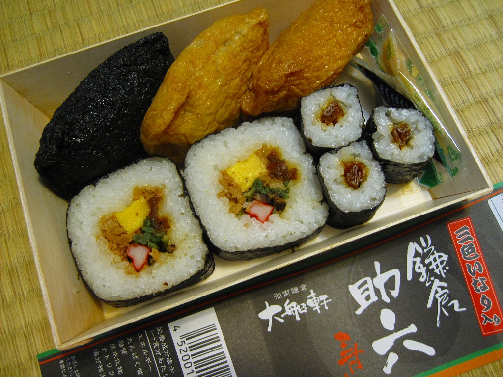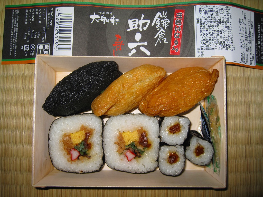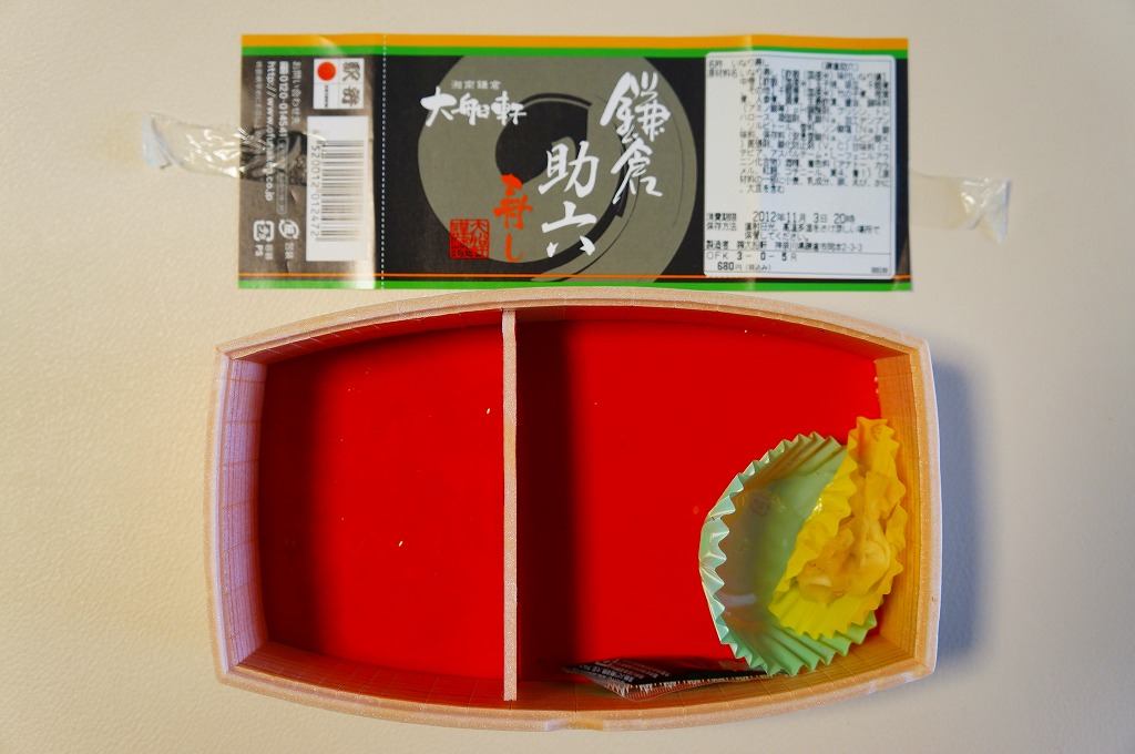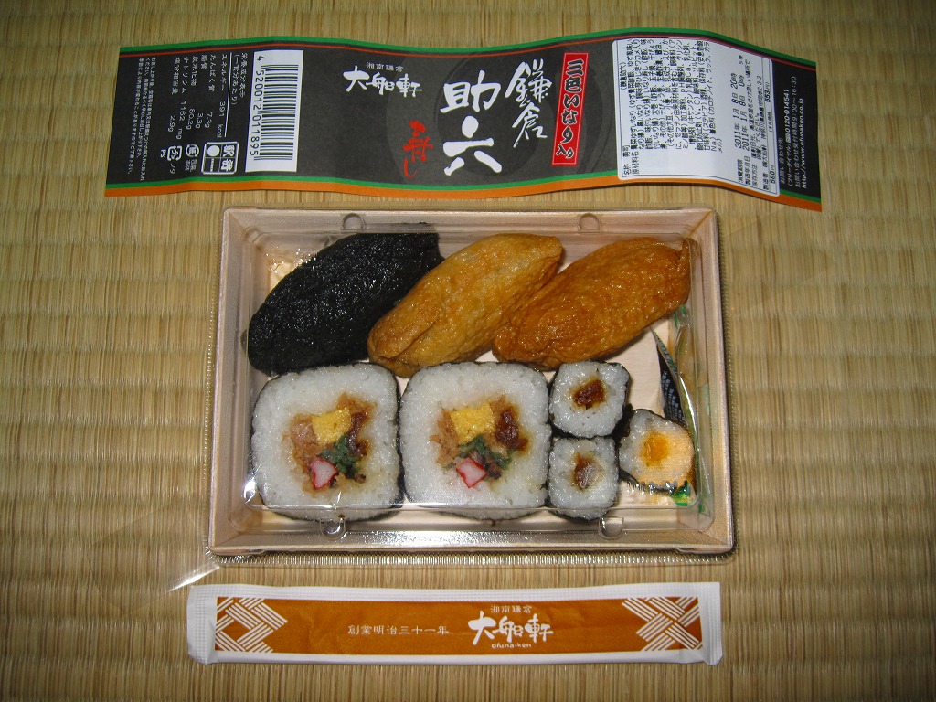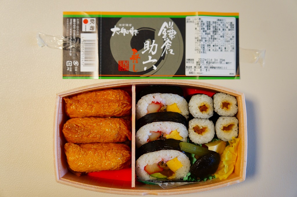下記の駅弁「鎌倉助六寿し」の、2012(平成24)年の秋時点での姿。名前と趣旨は変わらないようだが、容器が惣菜向けから駅弁向けの樽形平面な発泡材製に変わり、中身は太巻きが2個から3個に、細巻きが3個から4個に増えた一方で、3個のおいなりさんが三色から1種類に変わり、値段が100円も上がった。価格は購入時で680円、2015年時点で700円。