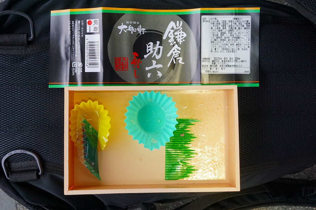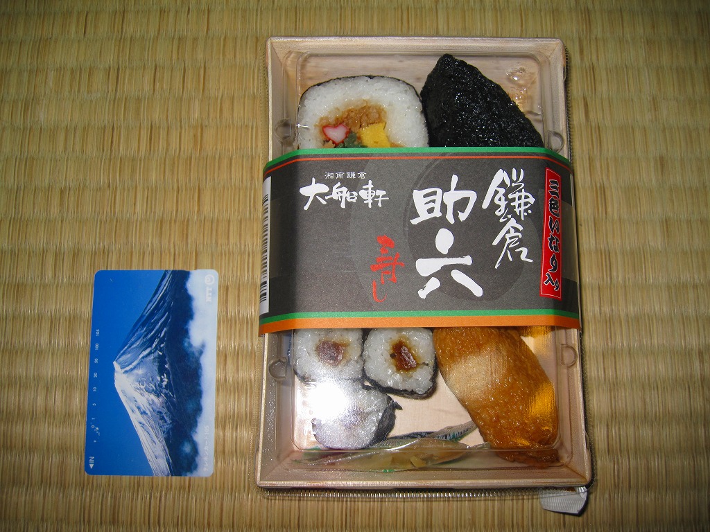 下記の駅弁「鎌倉助六寿し」の、2015(平成27)年の夏時点での姿。2012年のものから内容も価格も変わっていないが、特徴的な容器が平凡なお惣菜になり、趣味的に駅弁としての見栄えは落ちてしまった。趣味でなく買う方々にとって、何の影響もないとは思う。平成の普通寿司駅弁としては、徳島駅にあったものに次ぐ分量かもしれない。2015年内までの販売で、2016年に「大船軒のすけろく」へリニューアルか。
