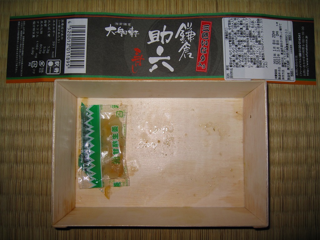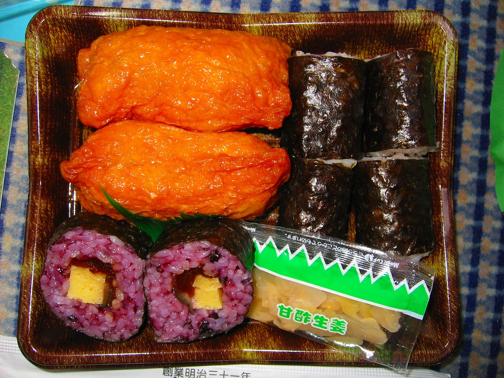 2005(平成17)年頃に発売か。スーパーでおなじみのプラ製の惣菜容器に、割りばしごと掛紙を巻いて、セロハンテープで留める。中身は鎌倉いなり2個、梅細巻2個、かんぴょう細巻2個、古代米中巻2個。
