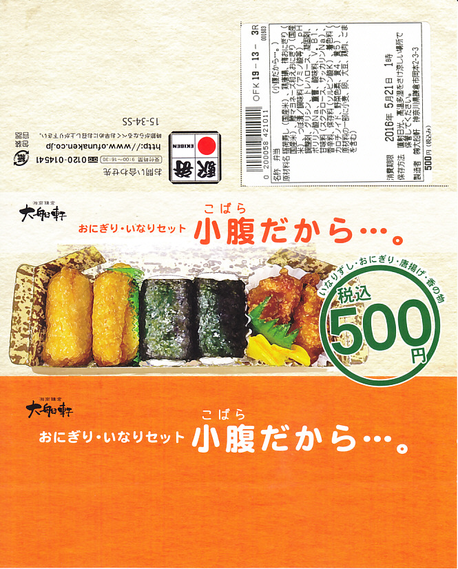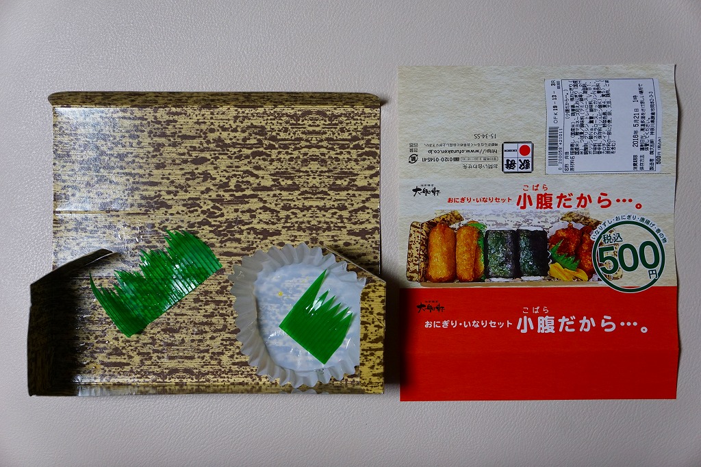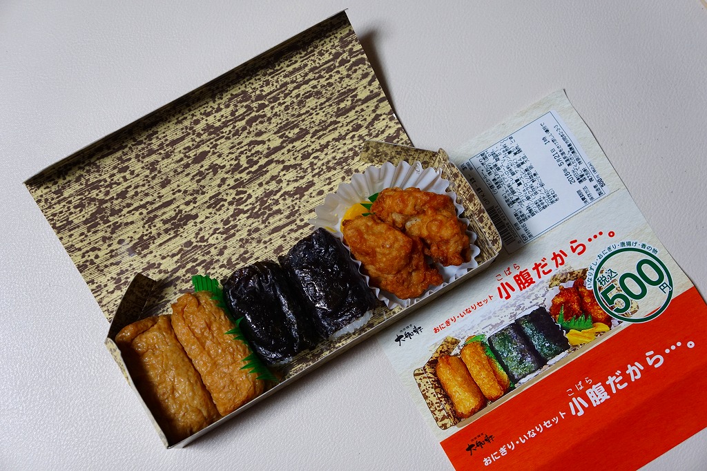 中身は掛紙の写真かイラストのとおり、小柄なおいなりさん2個、細巻風のウメとアジのおにぎり各1個、鶏唐揚2個、つぼ漬。小腹よりやや多めな、米飯の軽食。価格は2015年の発売時で500円、2020年時点で600円。2020年までの販売か。