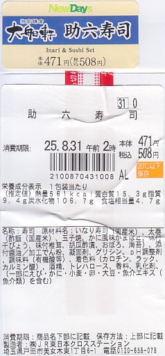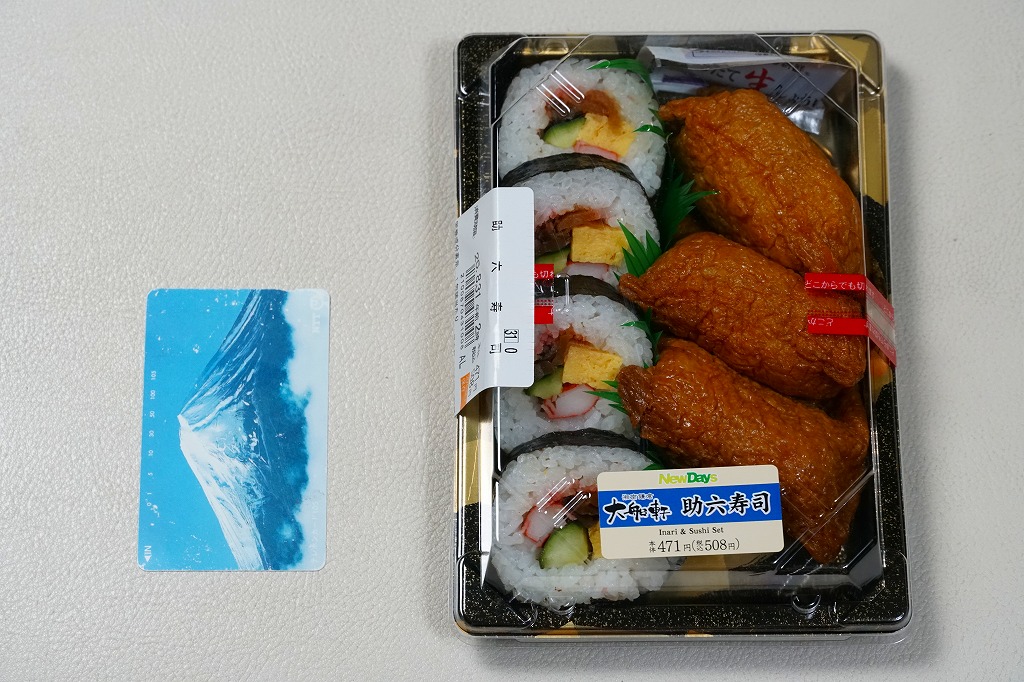 2025(令和7)年1月までに発売。商品に貼ったシールに「大船軒助六寿司」とあるが大船駅の駅弁ではなく、JR東日本の駅のコンビニ「ニューデイズ」で売られるコンビニ弁当であり、そのロゴマークもシールにある。コンビニ向けプラ容器に、いなりずし3個と太巻き寿司4切れと、醤油の袋を詰めた。つまり中身は上記の駅弁「大船軒のすけろく」から細巻きを除いたものであり、いなりずしと太巻きの味と中身はまったく同じ。調製元も調製所も同じなので、おそらく製造ラインも同じなのだろう。日本食堂の流れを汲む駅弁売店と、鉄道弘済会の流れを汲むコンビニで、体裁を使い分けている。価格は2025年の発売時で税込み498円、8月の購入時で508円。