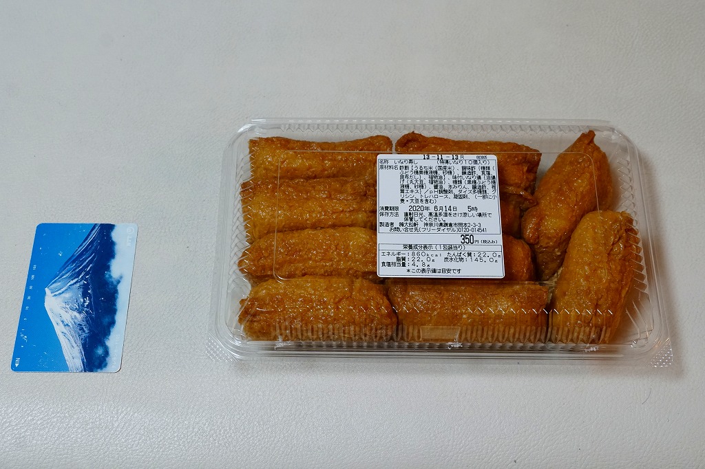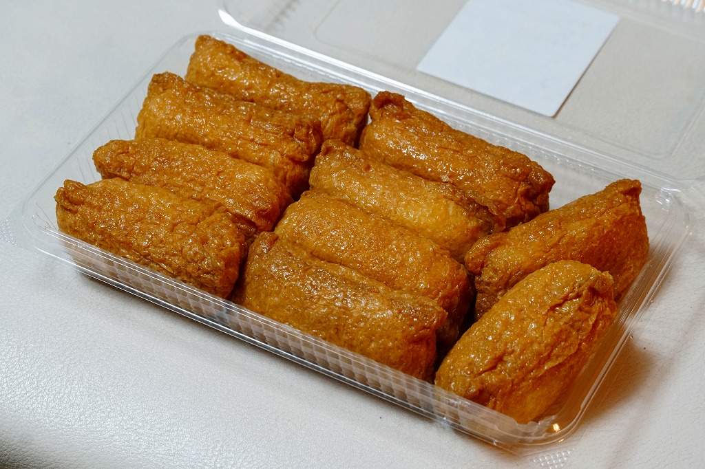 この姿と名前では、2016(平成28)年までに発売か。大船軒の稲荷寿司の特売品。いつでも買えるものではなく、大船駅と逗子駅の改札外の店舗では目撃例が多い。助六寿司の駅弁などに入るおいなりさんが、10個も入って350円。お店では「選外品の為、いなりの皮が破れたものが入っております。」と掲示し販売するが、味が異なるものではなく、今回購入したものにそんな品は入っていなかった。駅弁でない市販品より格安で、とてもお得な奉仕品。2018年3月までは300円で、もっとお徳だった。価格は2020年の購入時で350円、2022年6月から380円。2023年4月に大船軒がJR東日本クロスステーションに吸収合併され、大船の調製所が廃止されたため、その2023年5月限りで終売。
