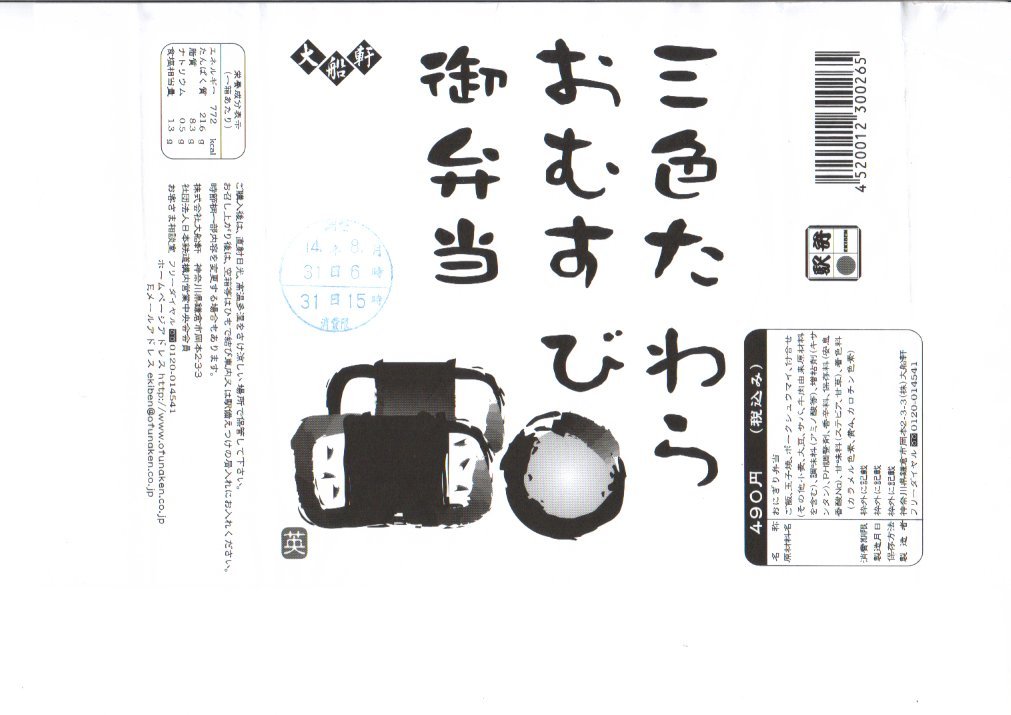 2002(平成14)年8月1日に発売。小柄な長方形の容器に、おかか・ふりかけ・梅の3種の俵飯、というより角が立った直方体飯を2個ずつ詰めて、あとは玉子焼と揚げ焼売と、おあげのようなものがひとつ入る。少量すぎるのはともかく、おかずの部分がスカスカで底が見えるのは見栄えが悪い。2005年6月現在で販売終了済み。