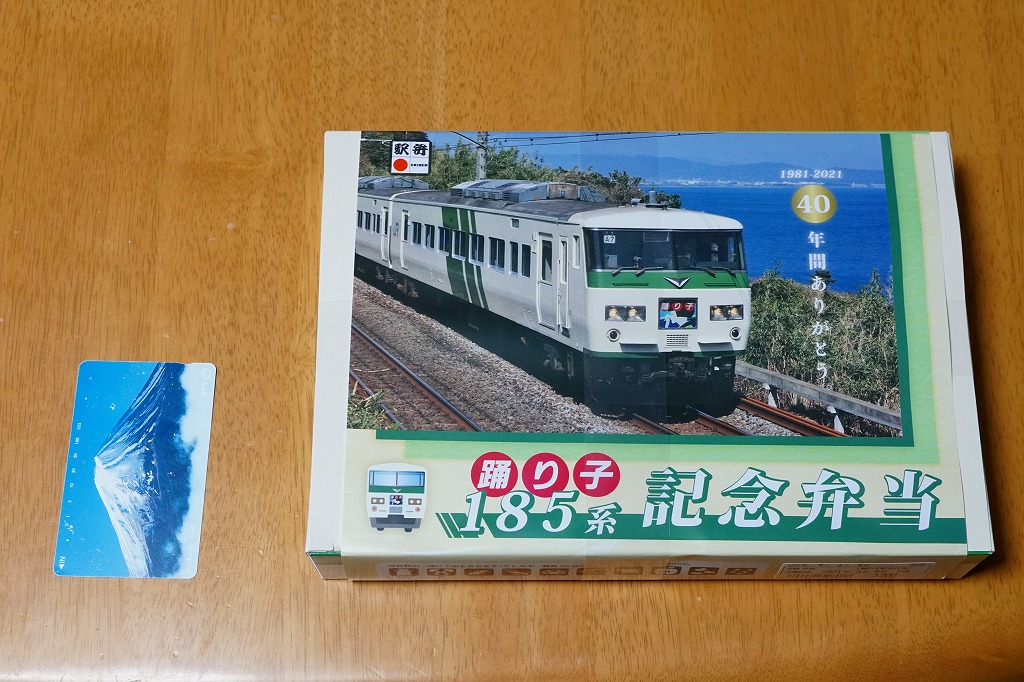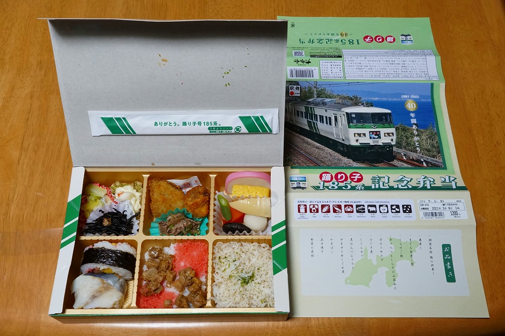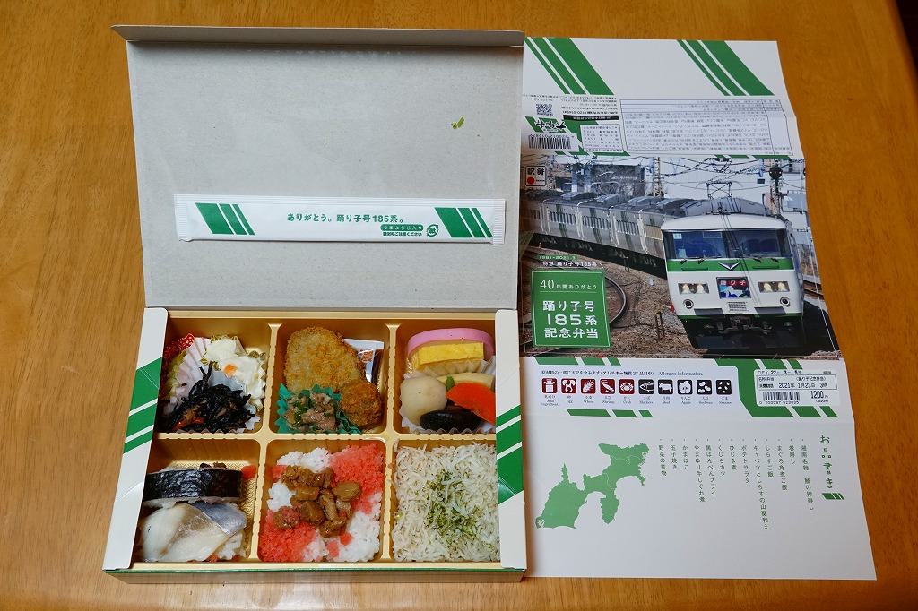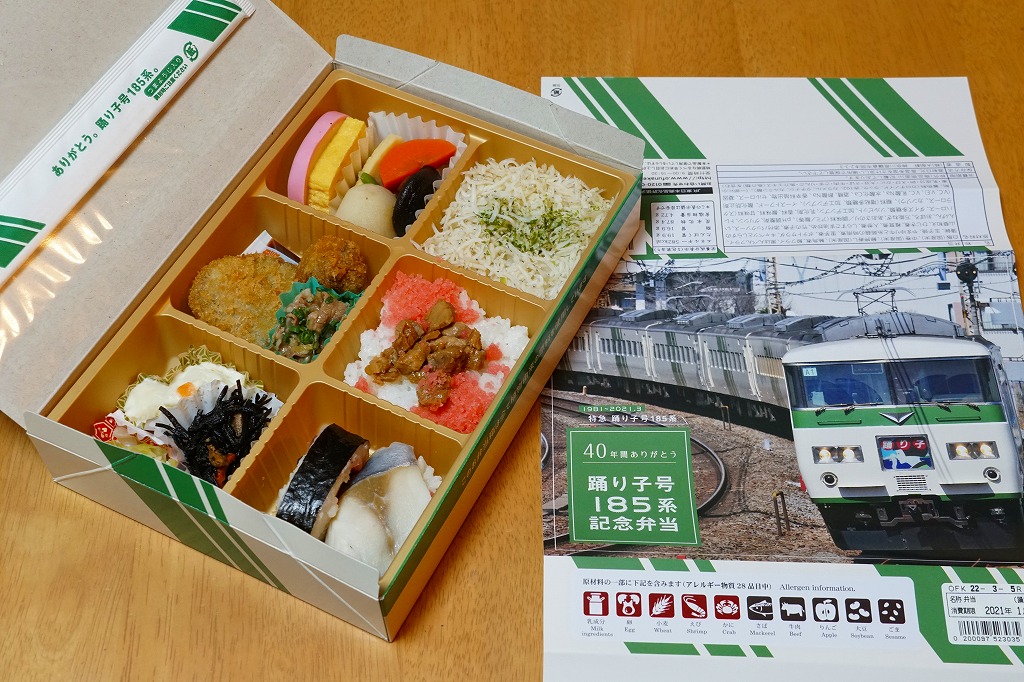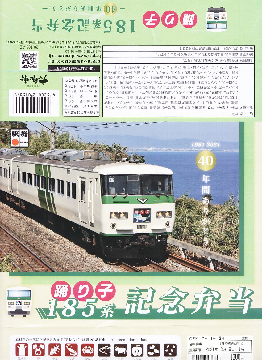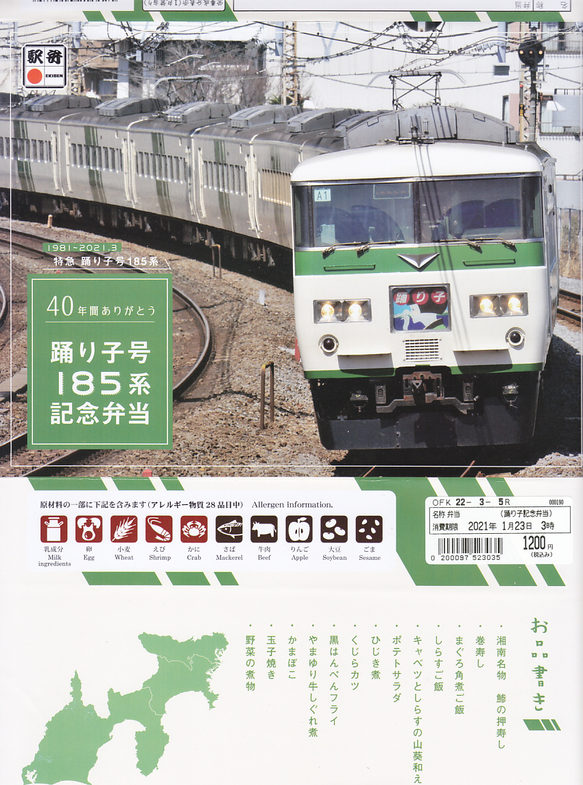 2021(令和3)年1月15日に東京、品川、新宿、上野、大船、藤沢、小田原、熱海の各駅で発売。2月25日に掛紙を替え、3月末まで販売する予定。この年の3月のダイヤ改正で、東京駅と伊豆を結ぶ特急「踊り子」から185系電車が引退することを記念した駅弁。掛紙の写真はもちろん、185系電車の特急踊り子号。加えて紙箱も箸袋も、その特徴である白地に緑のストライプの車体色をイメージしたものが、新たに起こされた。
