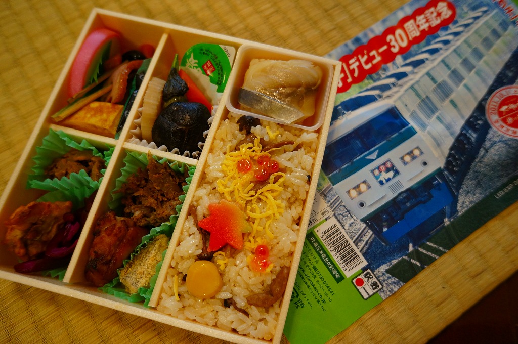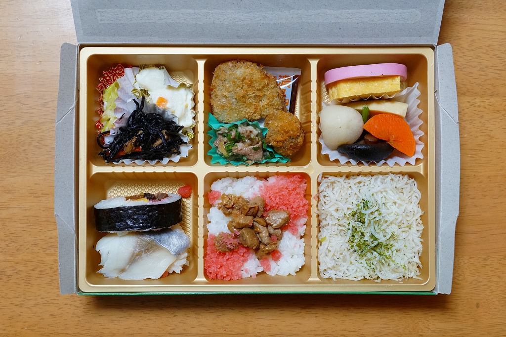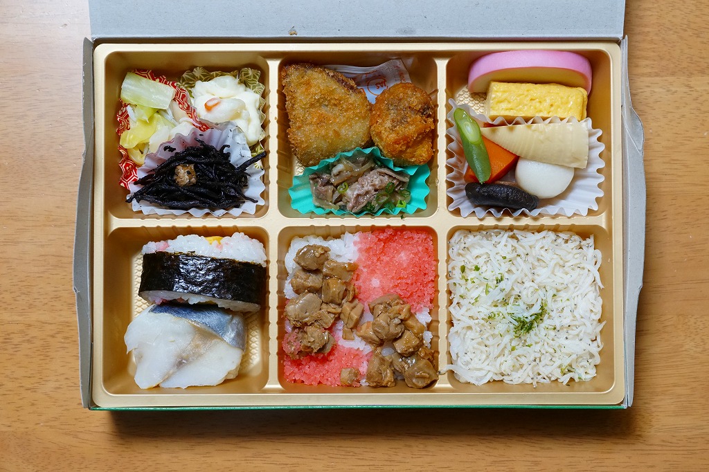 6区画の中身は、しらす御飯、桜でんぶとマグロ角煮の御飯、鯵の押寿しと太巻き、かまぼこと玉子焼と煮物、くじらカツと黒はんぺんフライと牛しぐれ煮、ひじきとポテトサラダとキャベツ和え。大船駅の駅弁を一部詰めていて、旅の食事にもできる内容。これを買う人の多くは185系が目当てだろうから、中身は気に留められないかもしれない。調製元によると予想外の売れ行きのため、3月14日で販売終了とのこと。