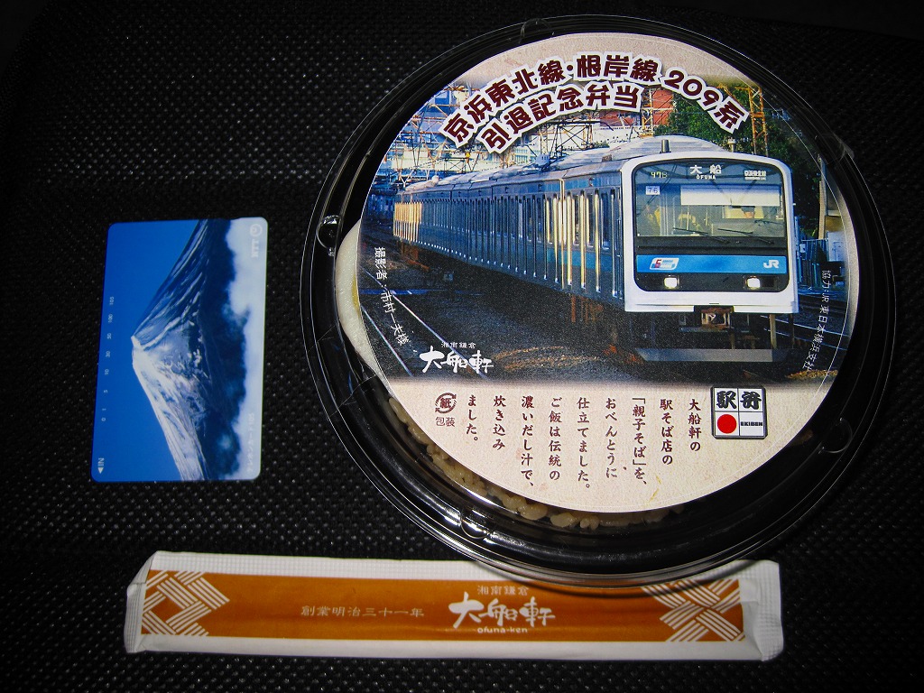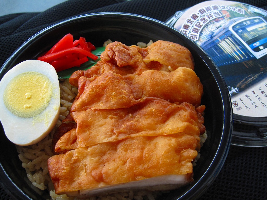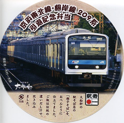 駅弁の名前のとおり京浜東北線・根岸線の209系電車の引退を記念して、2010(平成22)年1月24日から2月頃まで販売された記念駅弁。屋台向けの発泡材製どんぶりに透明なふたをして、209系電車の写真を印刷した円形の掛紙を置き、セロハンテープで留める。中身は茶飯の上に大きな鶏唐揚を載せて、煮玉子と紅生姜を添えるもの。
