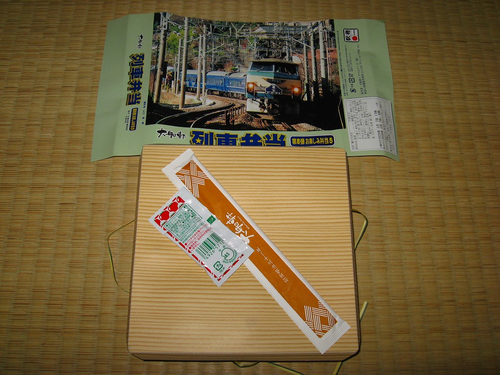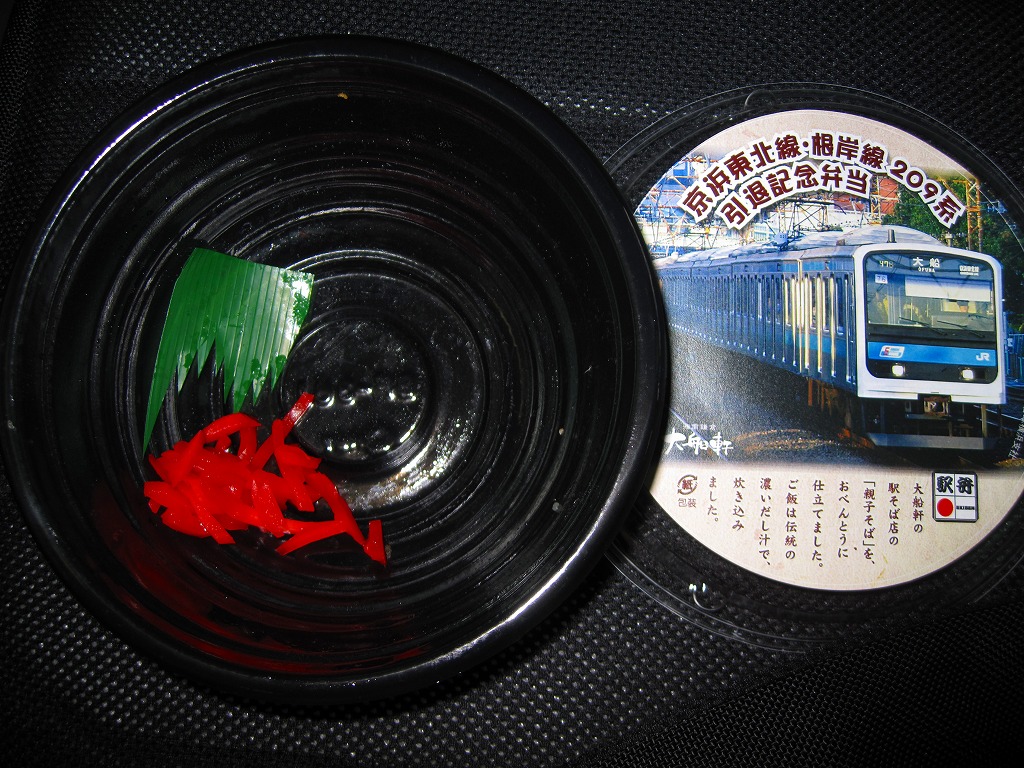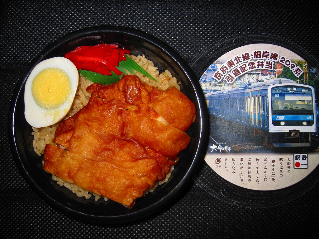 これは掛紙に記されるとおり、大船駅の駅そばメニュー「親子そば」を弁当にしたもの。通勤電車も都会の駅の駅そばも、常連客に多く提供されるものであるから、この組合せはとても的を射ている。味もB級グルメとしておいしい仕上がりなので、普段も売られていいと思う。