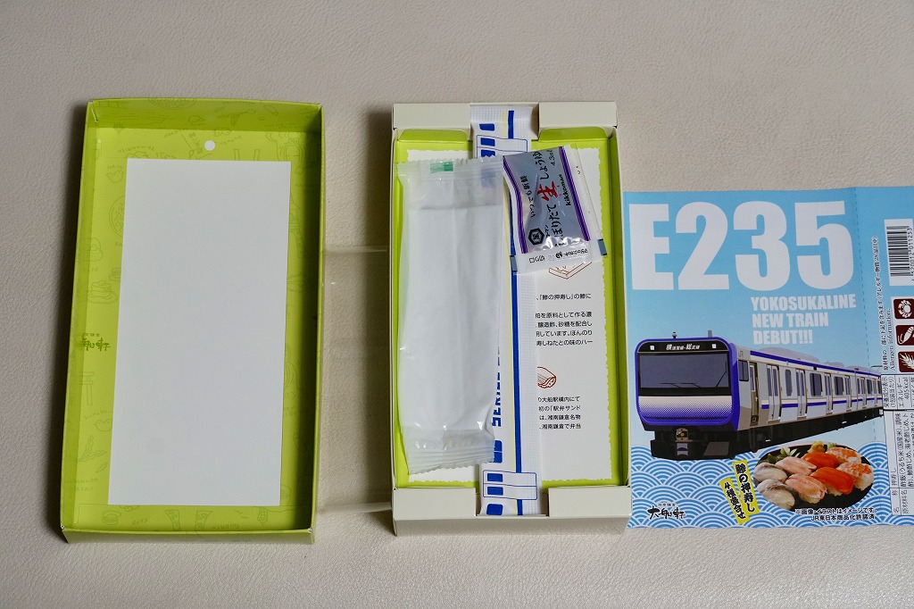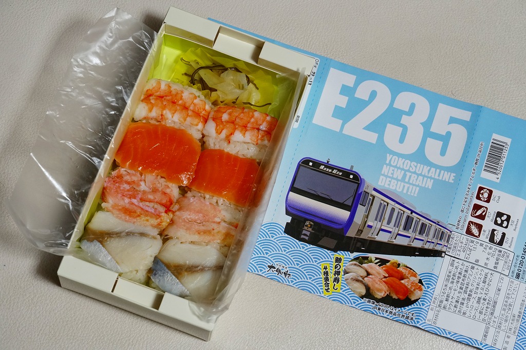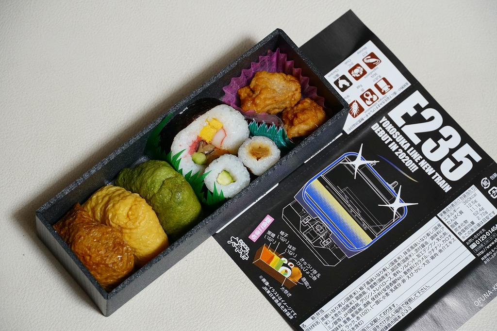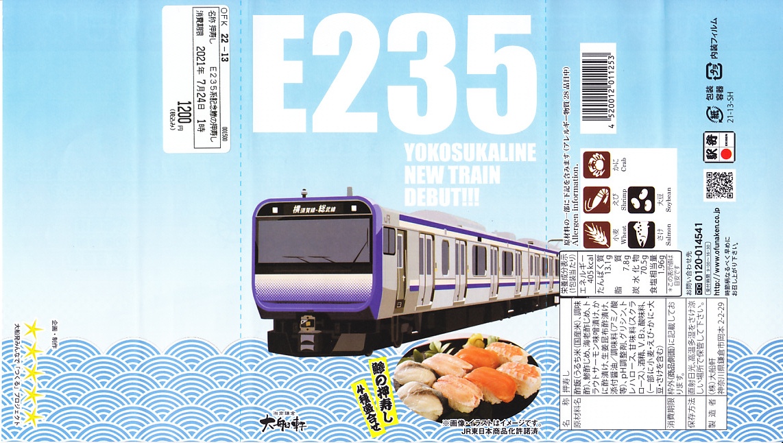 JR横須賀線のE235系電車の記念商品として、2021(令和3)年7月22日から8月31日までの金土日曜に販売。大船駅ではそう掲示したが、公式サイトにはなぜか「7月31日から8月31日の期間限定」と、発売日を変えて掲載した。黒い掛紙には電車の形式と前面のデザインと、駅弁の中身のイラストを描き、裏面には横須賀線のクイズを4問記す。