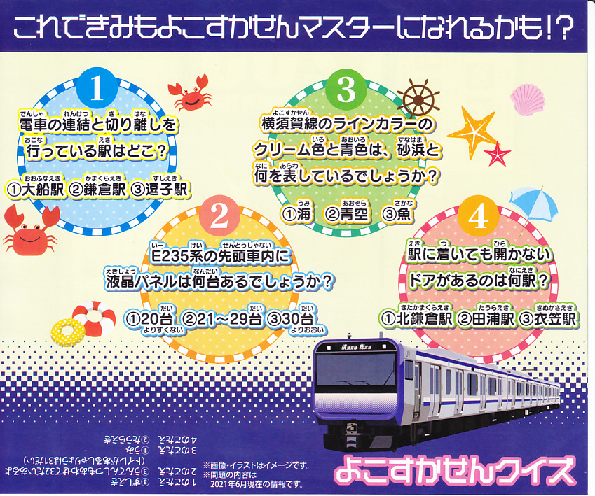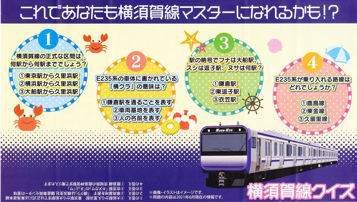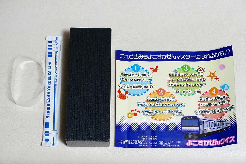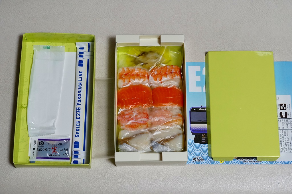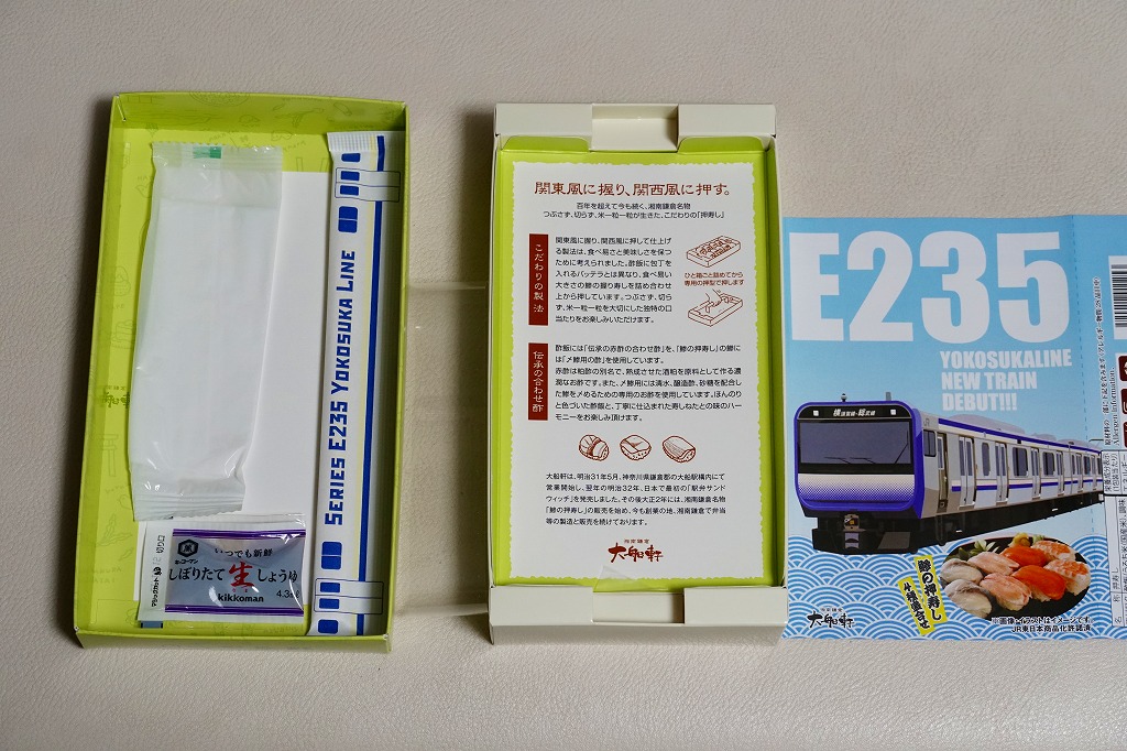 JR横須賀線のE235系電車の記念商品として、2021(令和3)年7月22日から8月31日までの金土日曜に販売。大船駅ではそう掲示したが、公式サイトにはなぜか「7月31日から8月31日の期間限定」と、発売日を変えて掲載した。黒い掛紙には電車の形式と前面のデザインと、駅弁の中身のイラストを描き、裏面には横須賀線のクイズを4問記す。