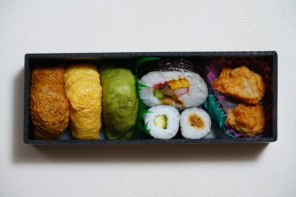 「鎌倉こまち」と題した中身は、細長い黒箱にお揚げが3色の三角いなり、太巻き1切れ、きゅうりとかんぴょうの細巻き各1本、唐揚げ2個。約10年前に売られた大船駅弁「鎌倉いなり」に、少し似た雰囲気。
