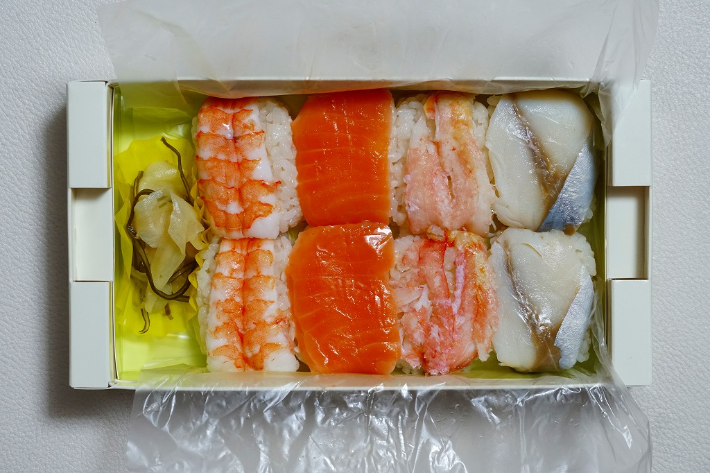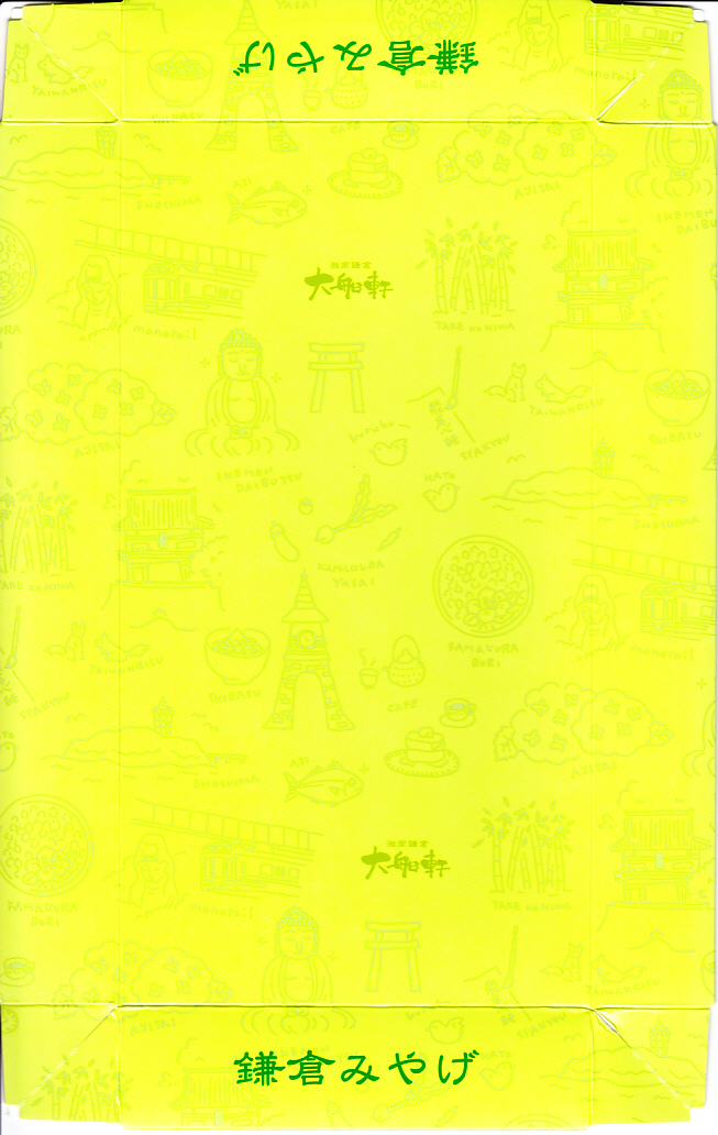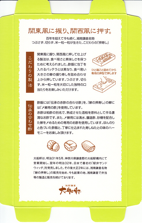 黄色い紙箱には鎌倉の名所のアイコンを薄くたくさん描き、その内ぶたには鯵の押寿しなど調製元の押寿司駅弁の特徴を記し、これに電車の形式とイラストと中身の写真を描く水色の掛紙を巻き、その裏面に横須賀線のクイズを4問記す。「鯵の押寿し4種盛合せ」と題した中身は、えび、サーモン、カニ、鯵の押寿しが各2個に、ガリと昆布。