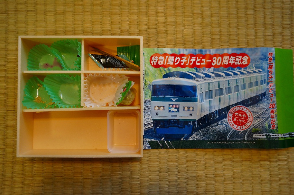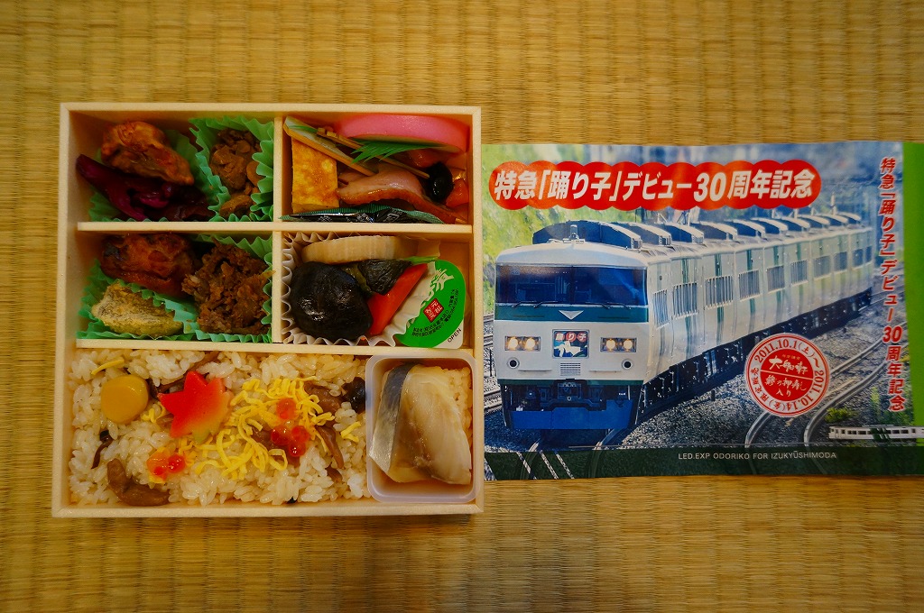 掛紙記載事項のとおり、特急「踊り子」デビュー30周年を記念し、2011年10月1日から31日まで販売された記念駅弁。大船駅に限らず東京駅から熱海駅まで、大船軒や東華軒を名乗る箇所を含むNREの駅弁売店で販売された模様。普段の大船駅弁でも使われる浅い正方形の容器を、踊り子号の走行写真を使う販売期間前半の10月1日から14日までのバージョンである掛紙で巻く。