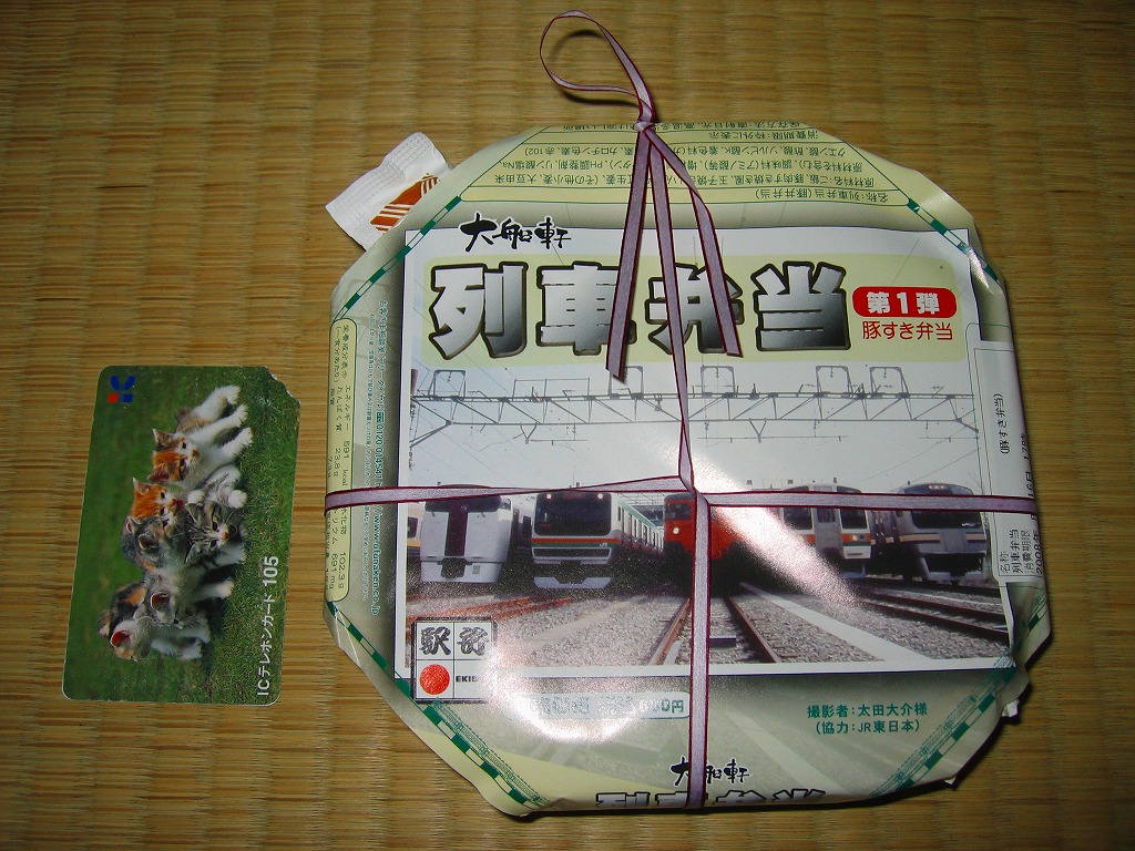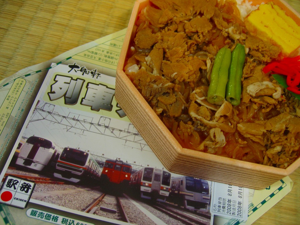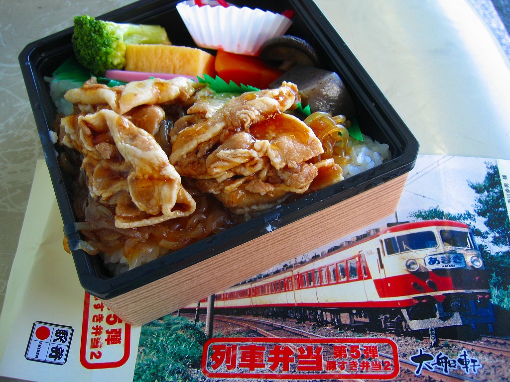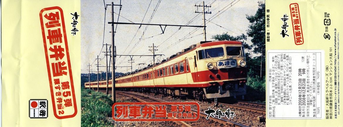 2008(平成20)年8月1日に、金土日曜限定駅弁として発売。正八角形の薄いプラ製容器に透明なふたをかけて、左から215系・E231系・113系・211系・E217系と大船ゆかりの通勤電車が並んだ写真を掲載する掛紙で包む。中身は白御飯の上に豚肉としらたきを敷き詰めて、玉子焼とインゲンと紅生姜を載せるもの。風味はコンビニかファストフードの豚丼そのもので、バリバリのB級グルメ。分量は少なめだが、鉄道ファンの中高生向けにピッタリな駅弁だと思う。この「第1弾」は8月限りで終売。