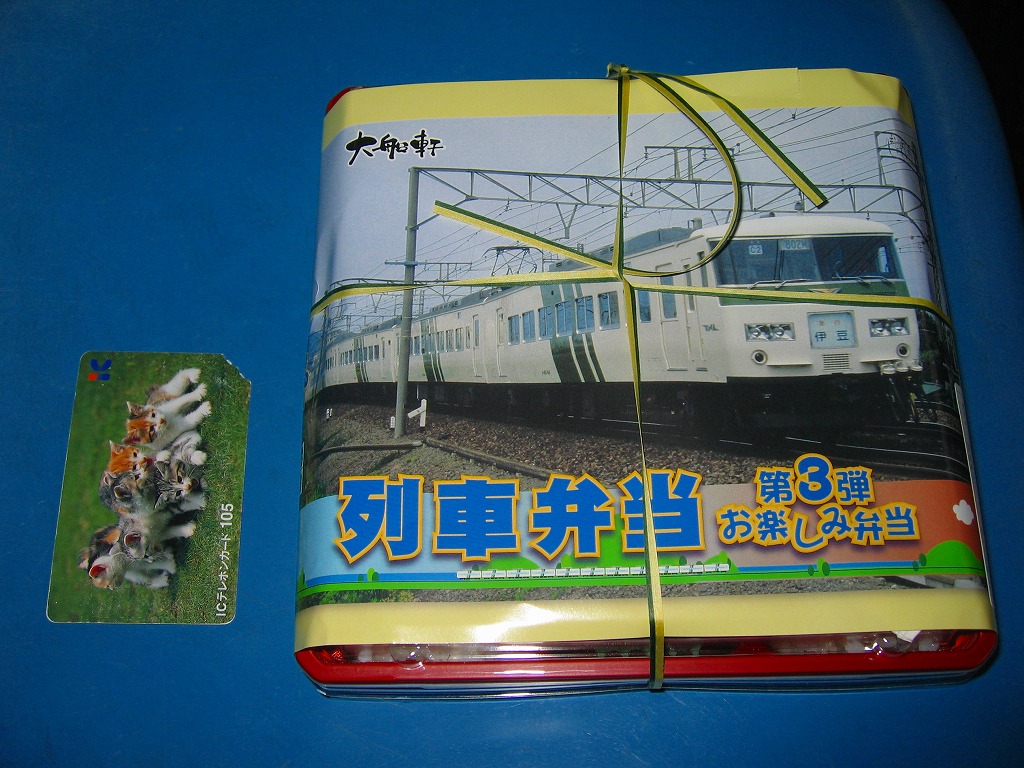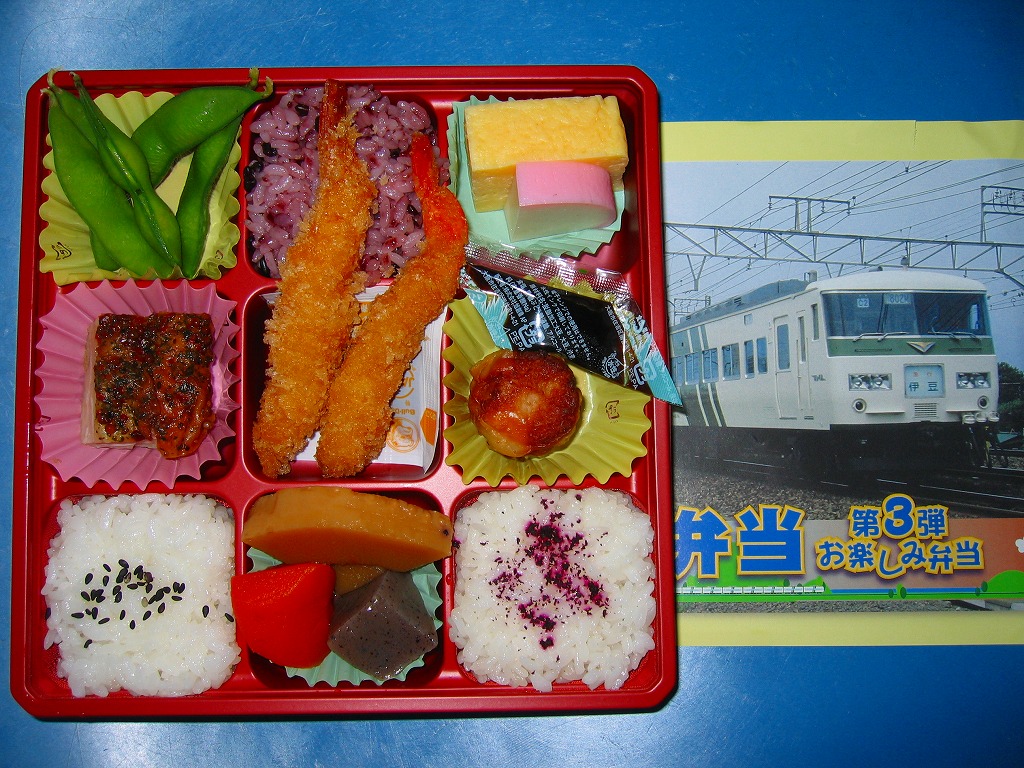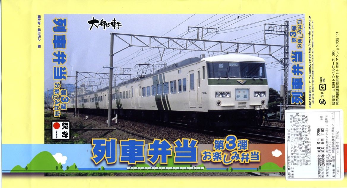 おそらく2008(平成20)年10月3日に、金土日曜限定駅弁として発売。第1弾や第2弾と異なる、9マスの区画を持つ正方形のプラ製の惣菜容器を使用、これに185系電車の急行「伊豆」の写真を使った掛紙を巻いて、ひもで十字にしばる。中身はゴマ振り白御飯、ゆかり振り白御飯、古代米の赤飯、細いエビフライ2本、ハーブチキン、カマボコと玉子焼、タケノコやニンジンなどの煮物、枝豆、たこ焼き。価格はまた90円上がったのに中身はやっぱりチープ、でも賑やかにはなっており、よりお祭り風味やイベント性が出ている。この「第3弾」は10月限りで終売か。
