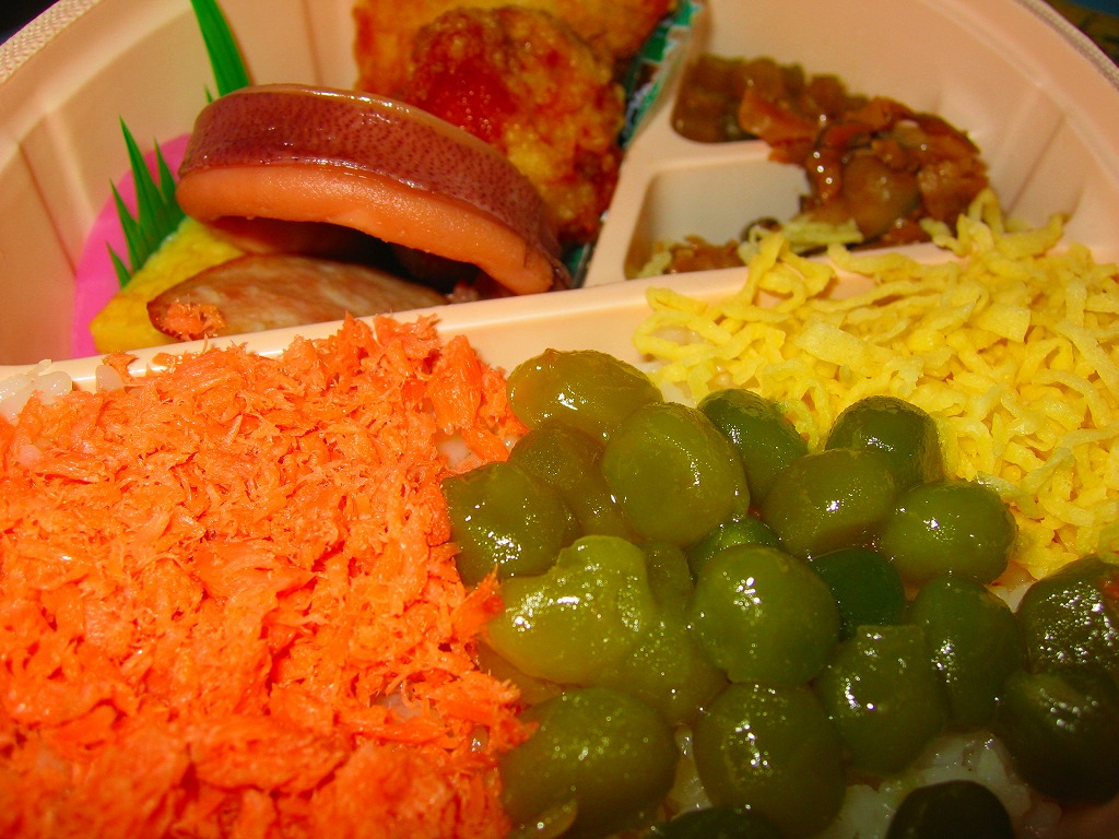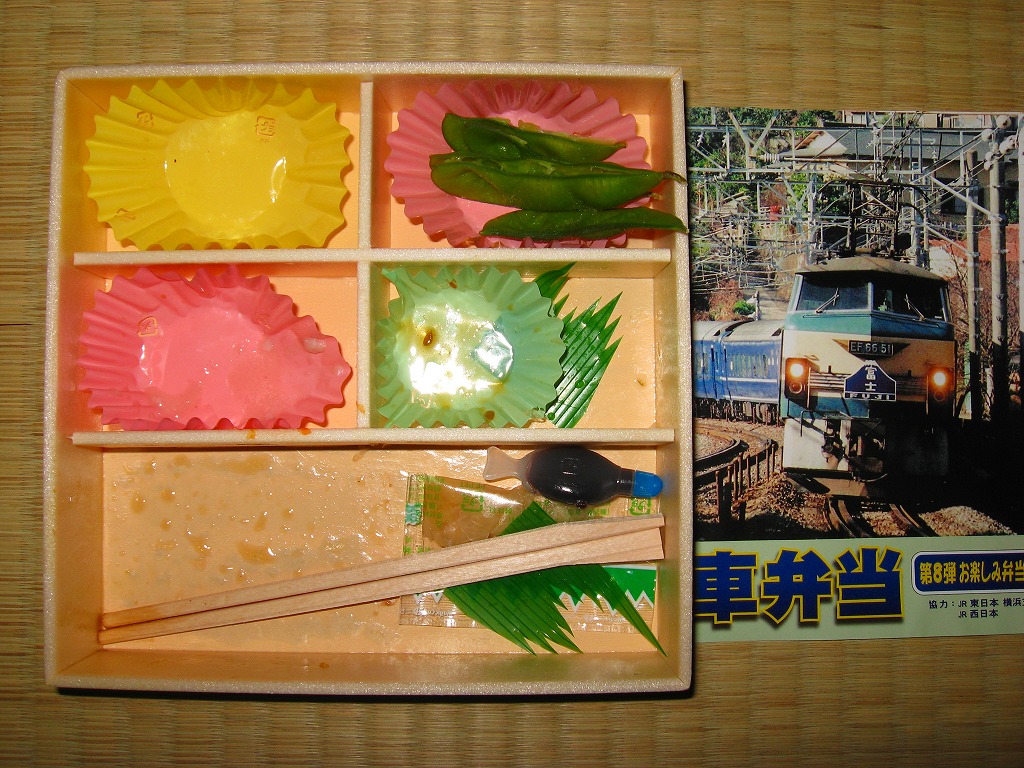緑と橙の湘南電車の色を表したいがために、弁当として過多の甘いウグイス豆と、過少の無味な鮭フレークと、色あせた業務用錦糸卵を、不思議に魚臭く酸っぱい酢飯に載せる、味覚が狂いそうな御飯部分。おかずも付け合わせも安っぽく、期間限定は良かったかも。掛紙収集目的の駅弁。