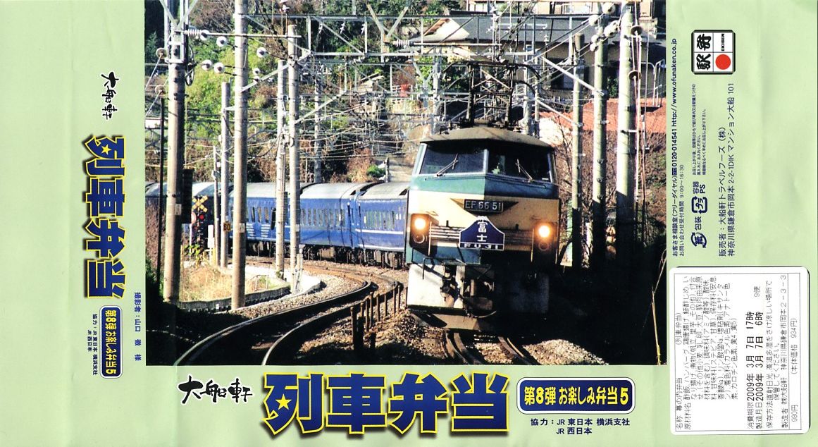 第6弾が1月で「お楽しみ弁当3」なEF5861牽引「踊り子」で800円、第7弾が2月で「お楽しみ弁当4」なEF66牽引「はやぶさ」で880円、そしてこの第8弾が3月で「お楽しみ弁当5」なEF66牽引「富士」で980円と続いた、大船軒の月替わり企画駅弁。なお、この企画はこの第8弾で終了した模様。