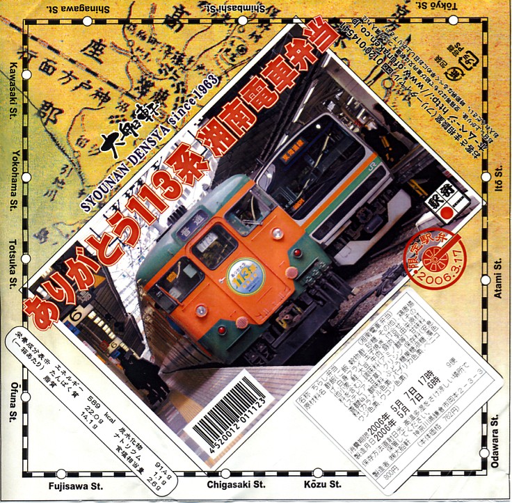 2006(平成18)年3月の東海道本線東京口からの113系電車の引退に間に合わず、4月と5月に販売された記念駅弁の5月版。大船駅弁「まぐろの浜ごはん」などでも使われる楕円形の容器に、113系電車の写真を載せた掛紙をかけ、湘南電車色の紙ひもでしばる。中身は酢飯の上に鮭フレークとウグイス豆と錦糸卵を敷き、白身魚フライ、鶏唐揚、イカ、ソーセージ、玉子焼、蒲鉾などを添える。
