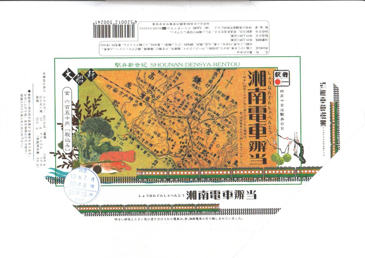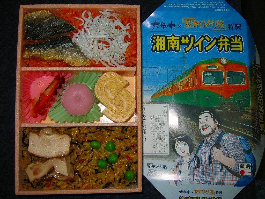中身は鶏照焼を載せてひじきを混ぜたカレー御飯と、焼きサバとシラスを載せたトマト御飯に、玉子焼とミニ大福などを添えるもの。御飯の色で湘南電車の塗り分けを表現している。千円の駅弁でこの内容と分量ではどうかと思うが、大船の記念駅弁にしては味が無難なジャンクフード。2009年までの販売か。